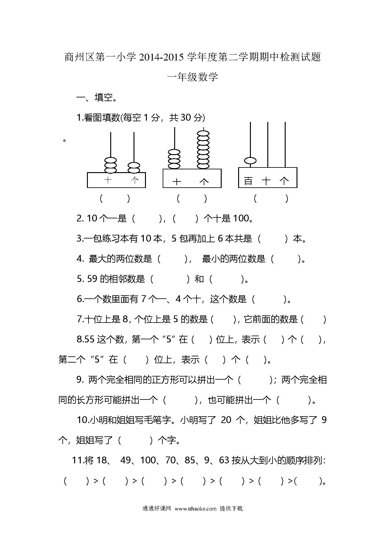 商州区第一小学2014-2015学年度第二学期一年级数学期中试题.pdf