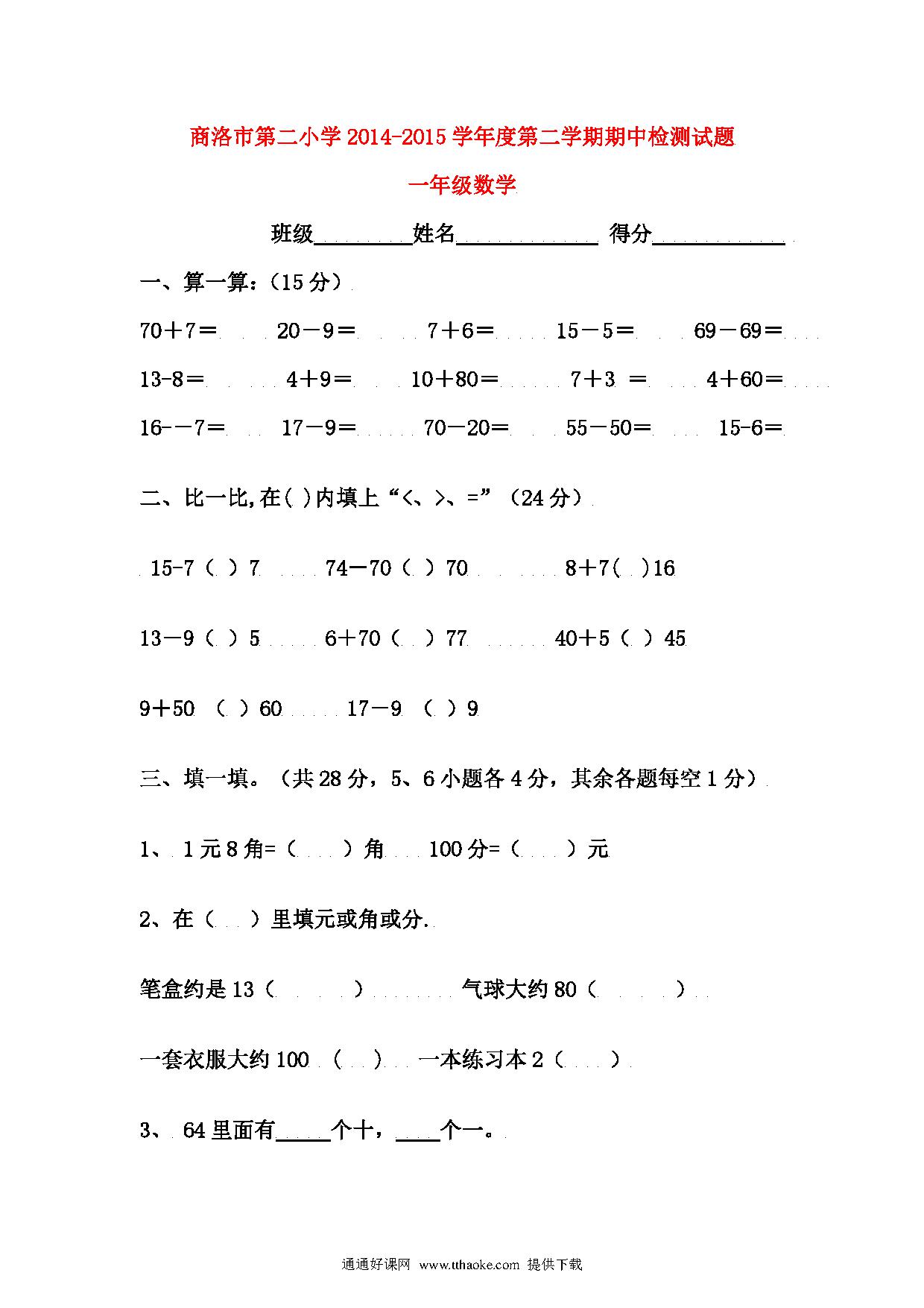 商洛市第二小学2014-2015学年度第二学期一年级数学期中检测试题.pdf