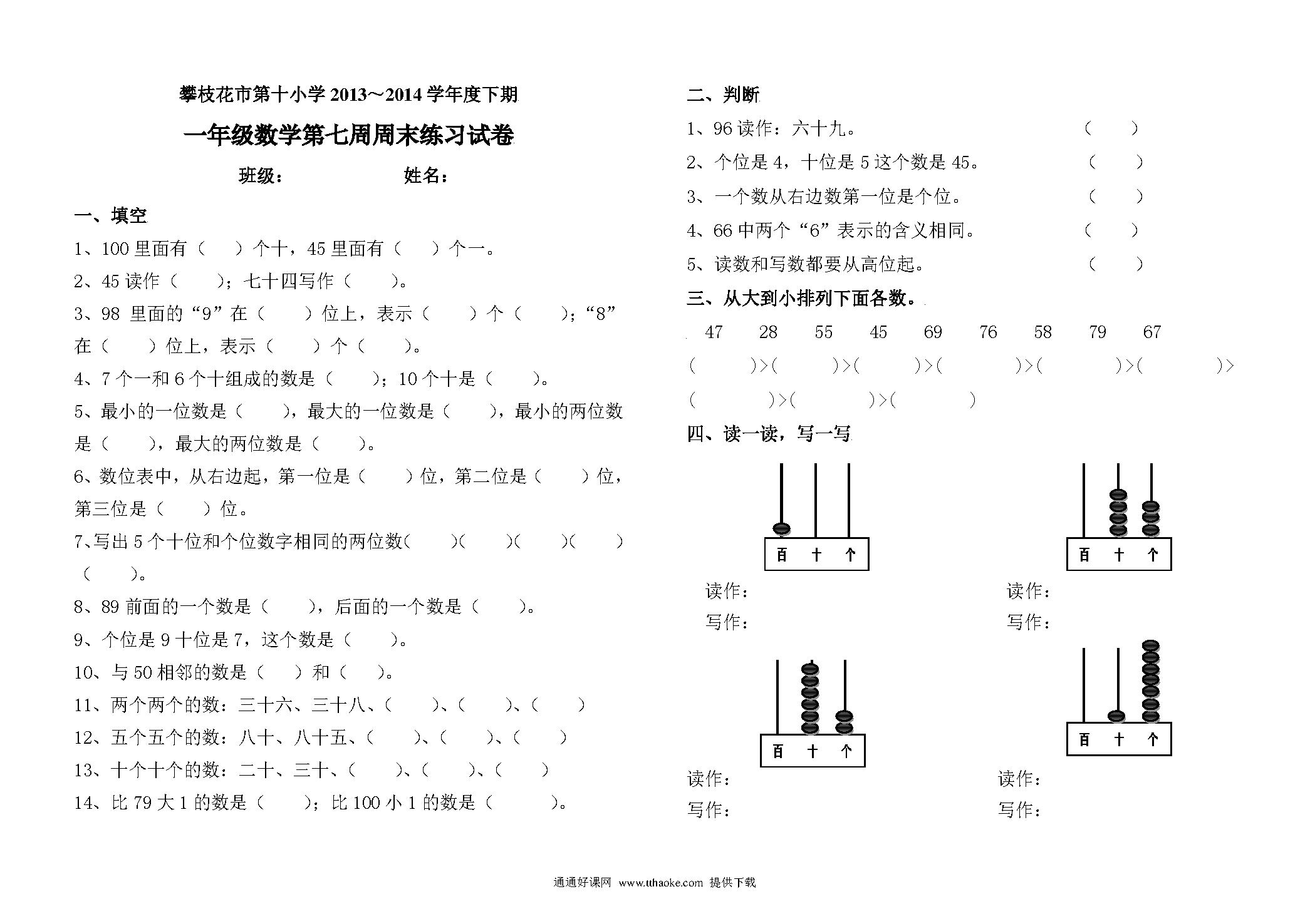 2023人教版一年级数学下册期末综合复习题免费下载打印(附答案)