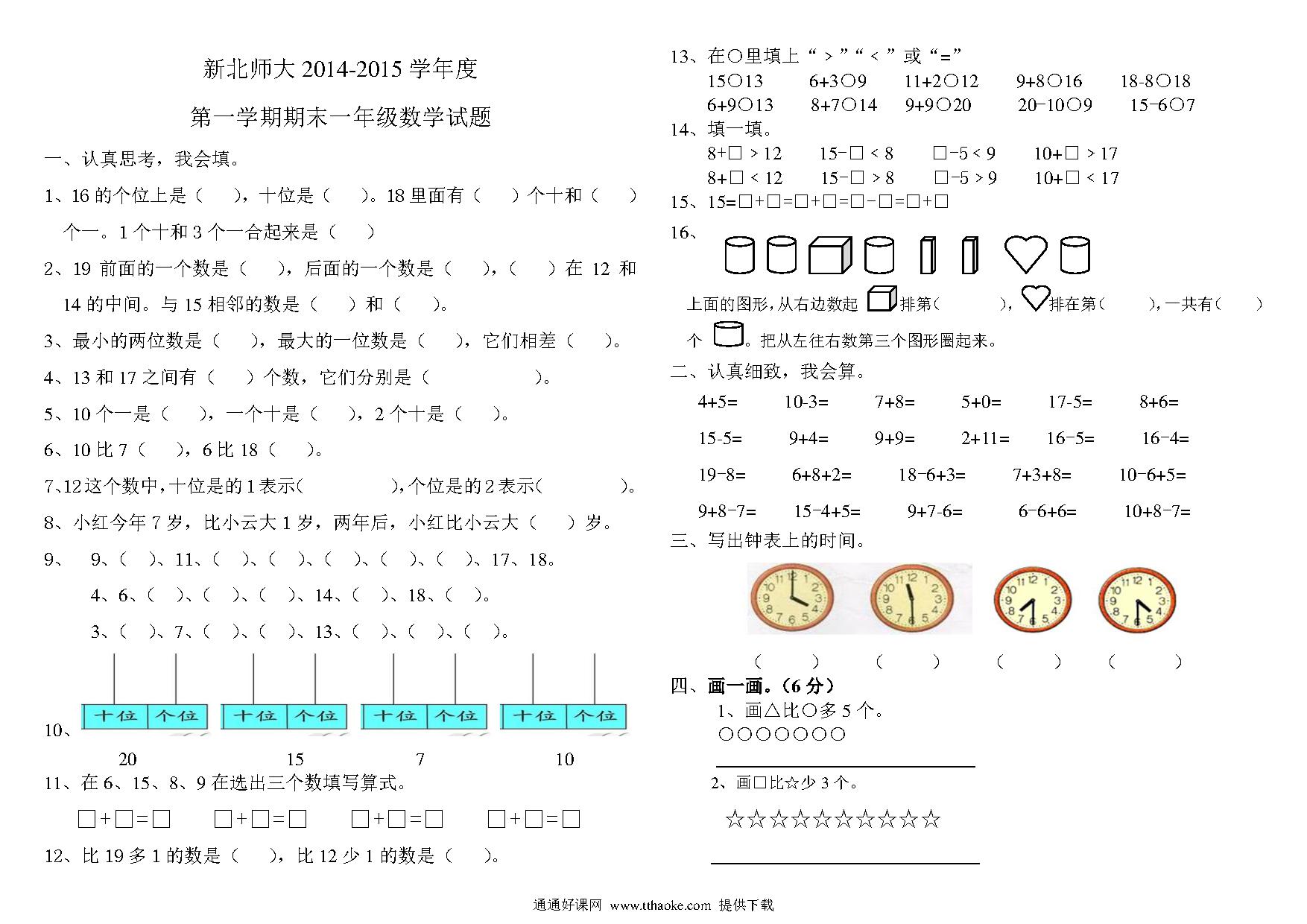 人教版一年级数学上学期期中竞赛试卷免费下载打印(附答案)
