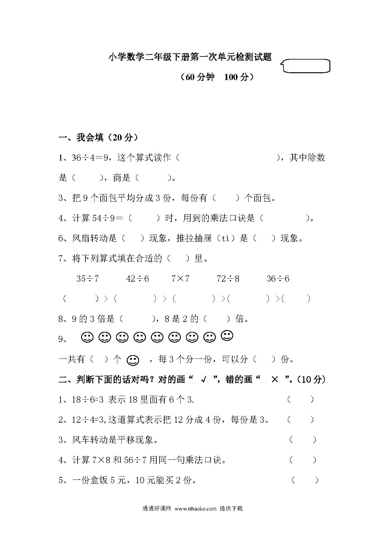 2015年小学数学二年级下册第一次单元检测试题