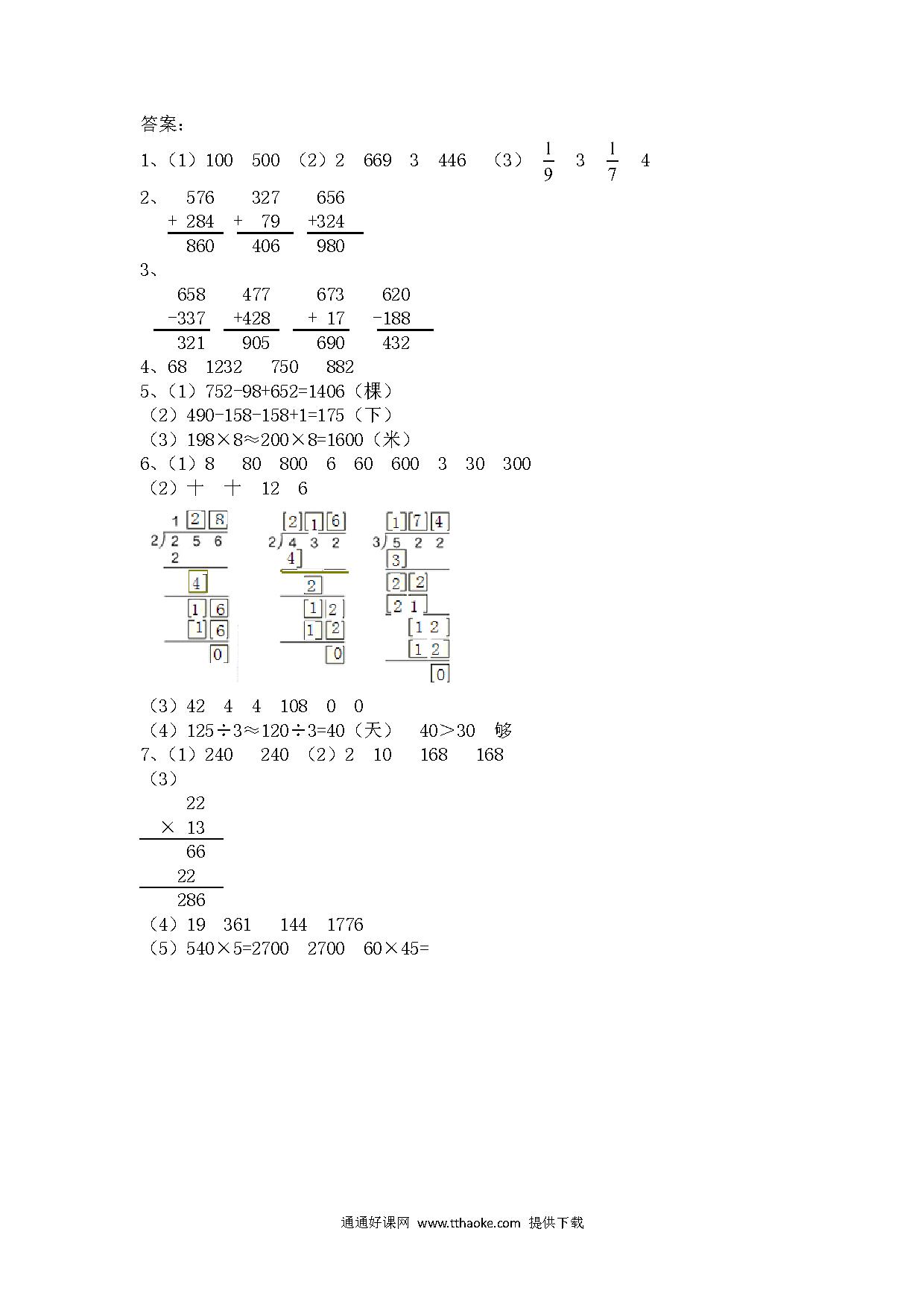 2022年人教版三年级数学上册期中基础复习卷可下载(附答案)