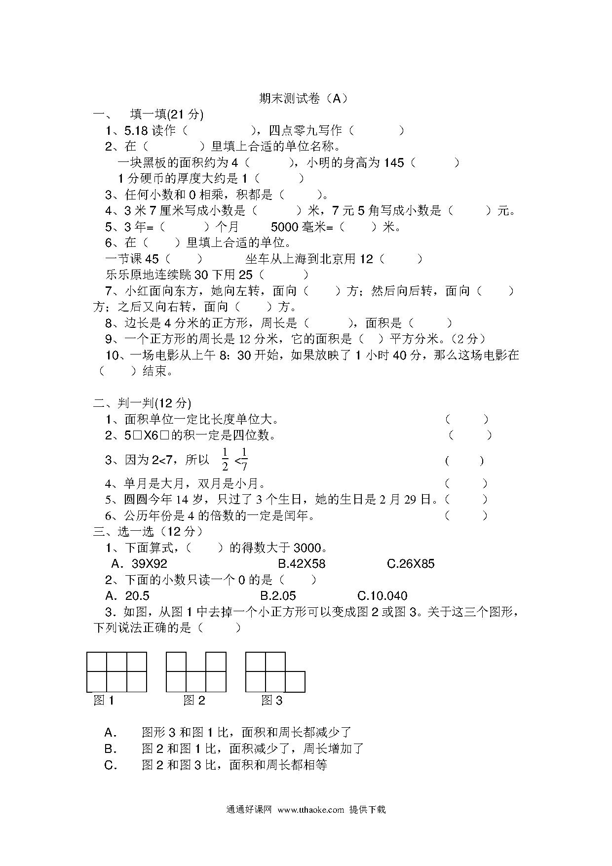 人教版2022-2023三年级数学上册第五单元测试卷可下载(附答案)