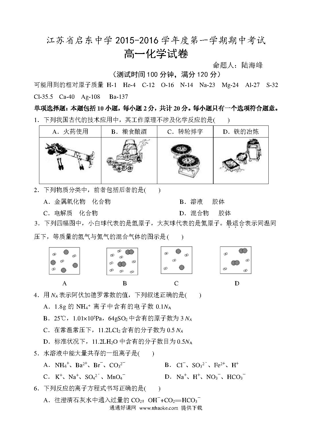 江苏省启东中学上学期高一化学期中试卷及答案.pdf
