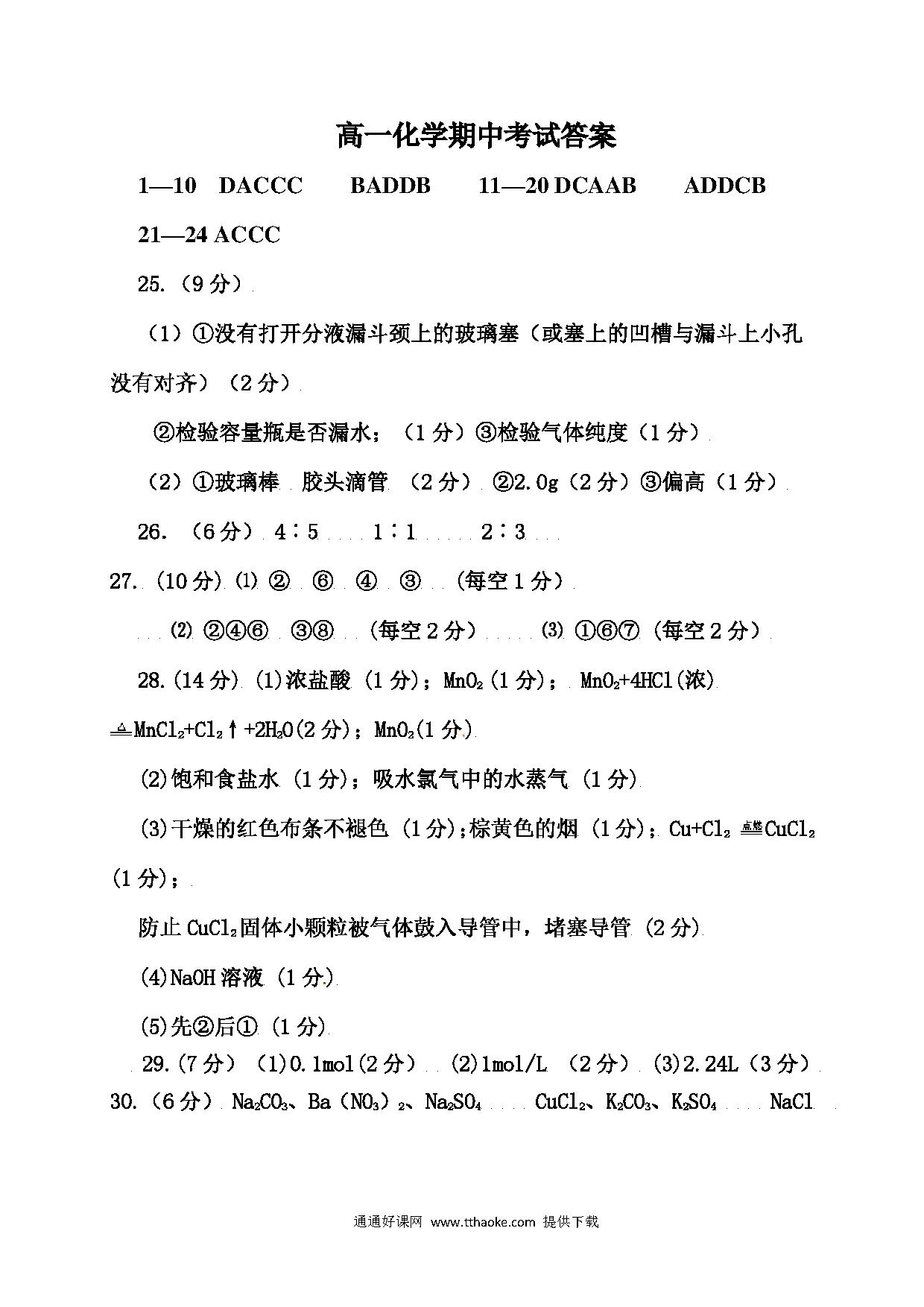 陶县一中第一学期高一化学期中试题及答案.pdf