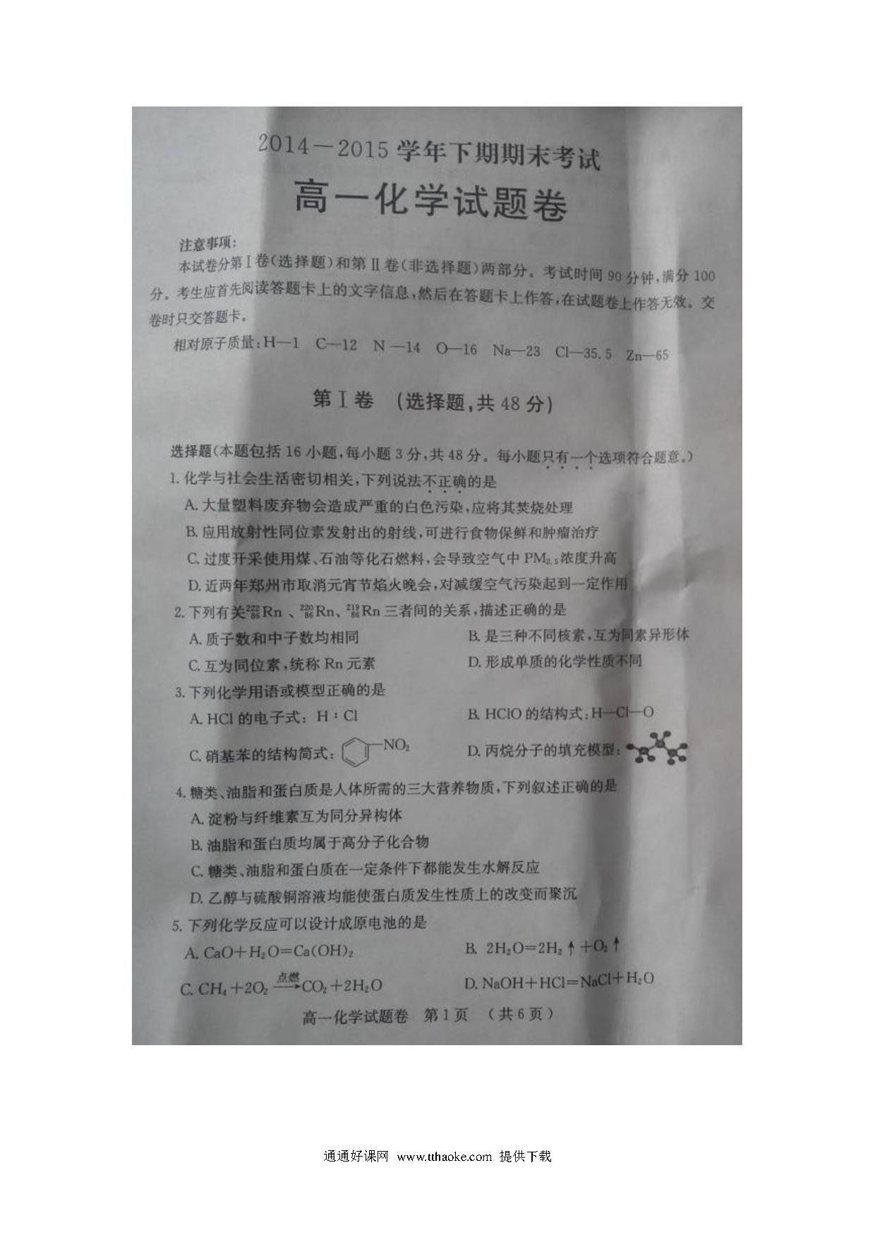 郑州市高一下学期期末考试化学试题及答案.pdf