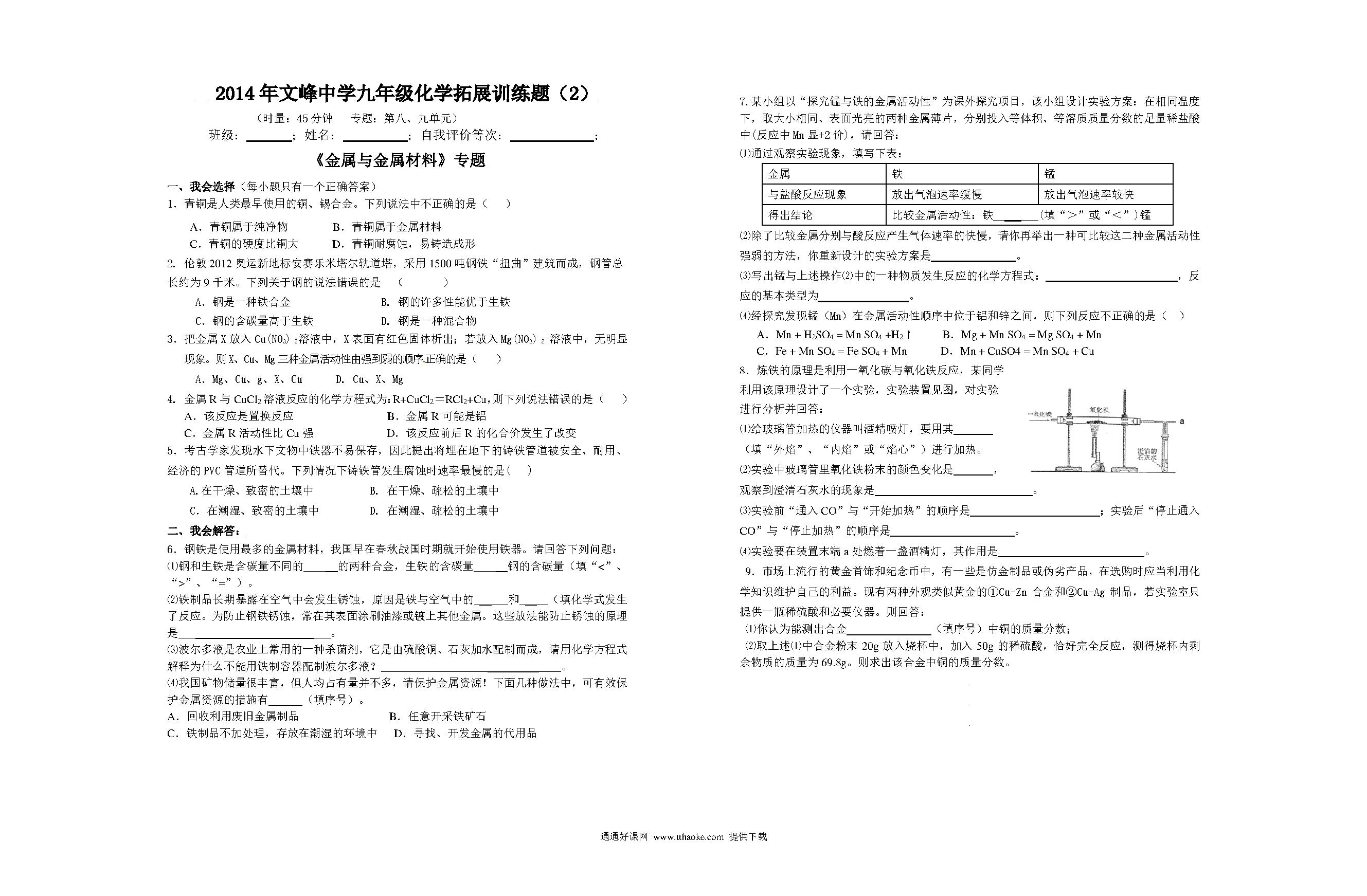 泉州一中2018届初三第二学期化学期中考试试及答案