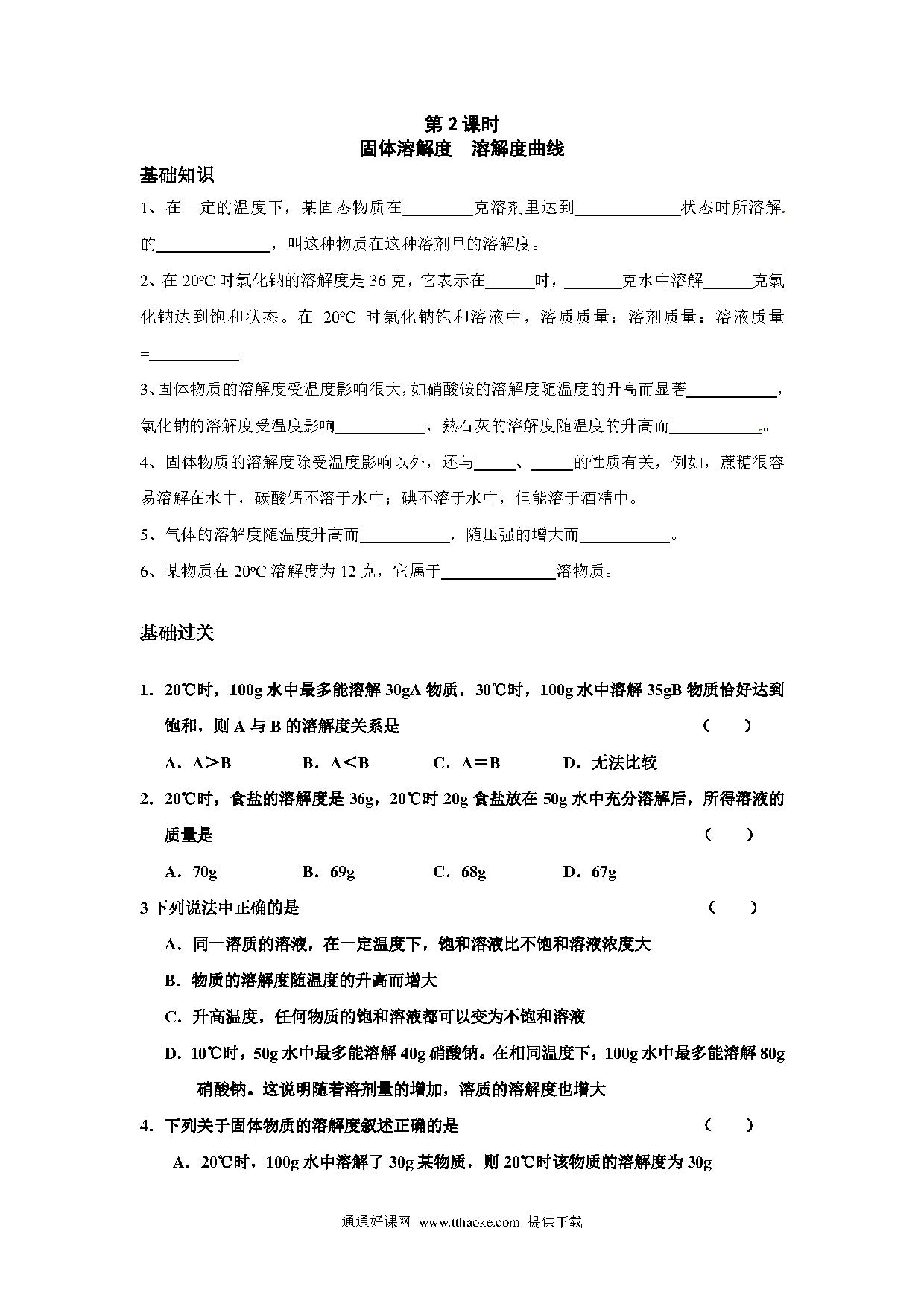 2014第九单元溶解度第2课时练习题.pdf
