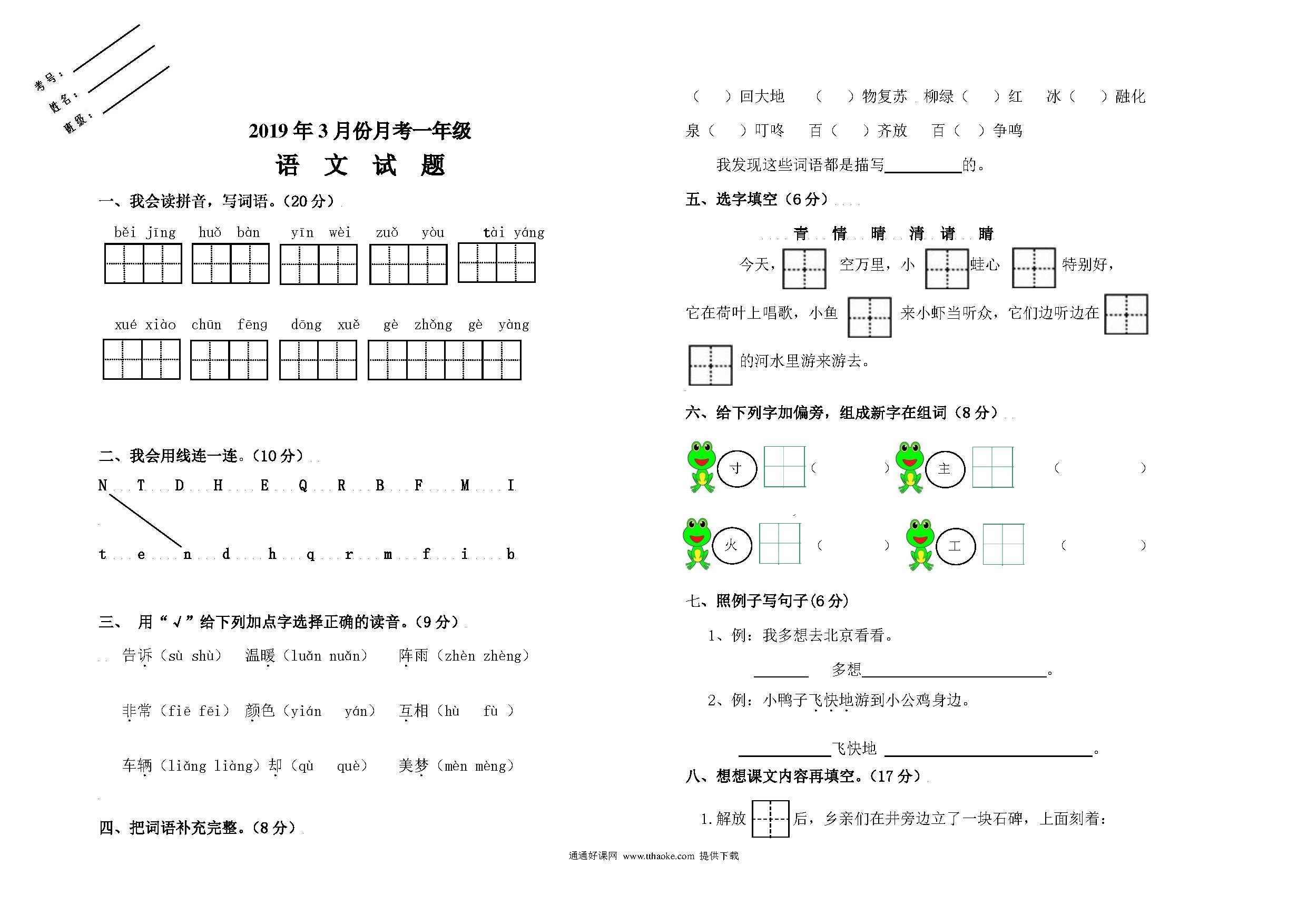 3月一年级语文月考试卷及答案.pdf
