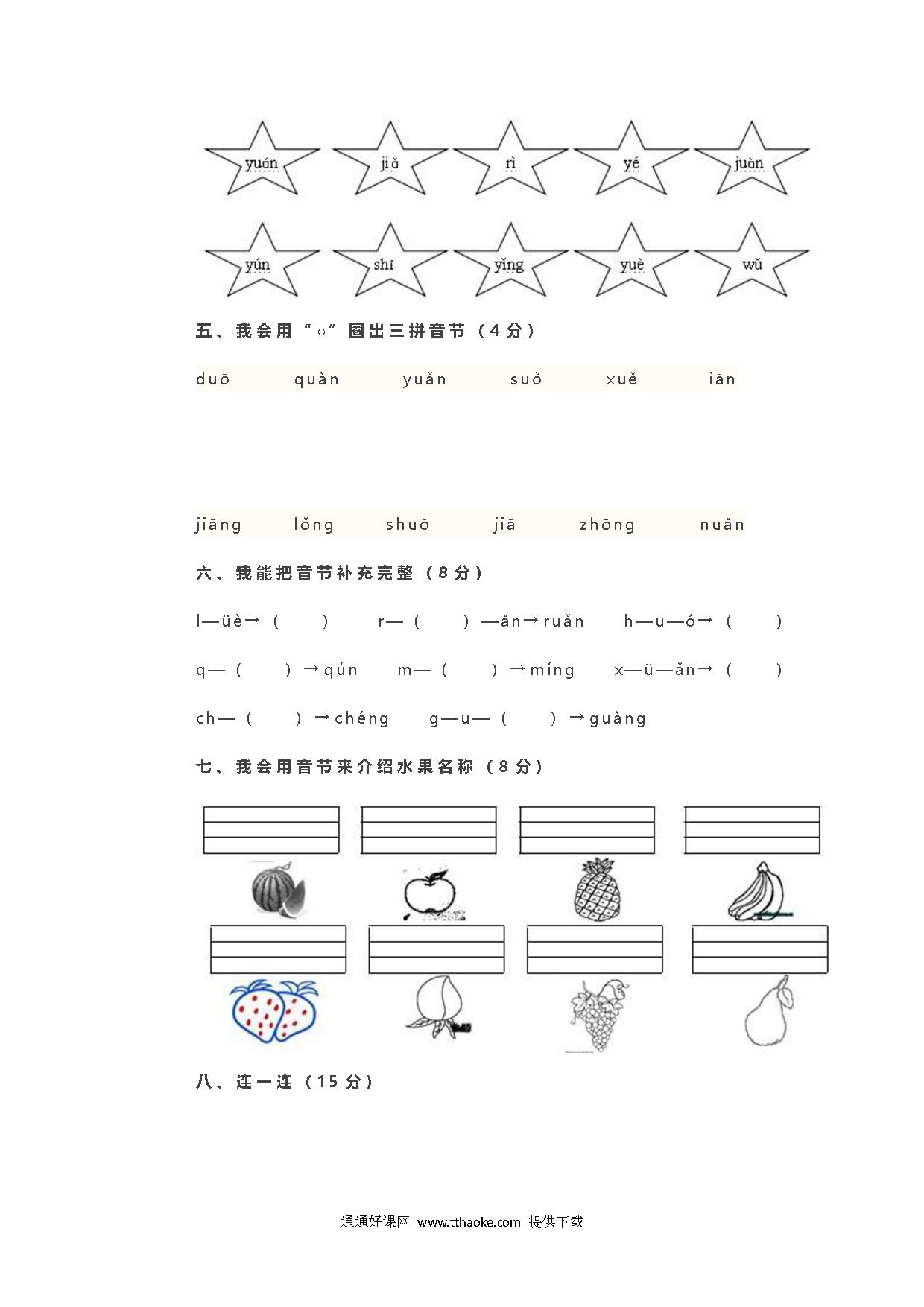 2023-2024部编版一年级语文上册第二单元拼音综合检测卷免费下载打印