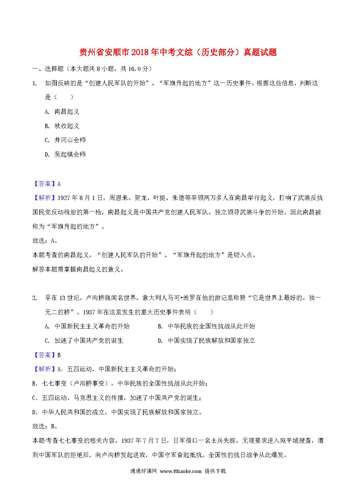 贵州省安顺市2018年中考文综(历史部分)真题试题(含解析).pdf