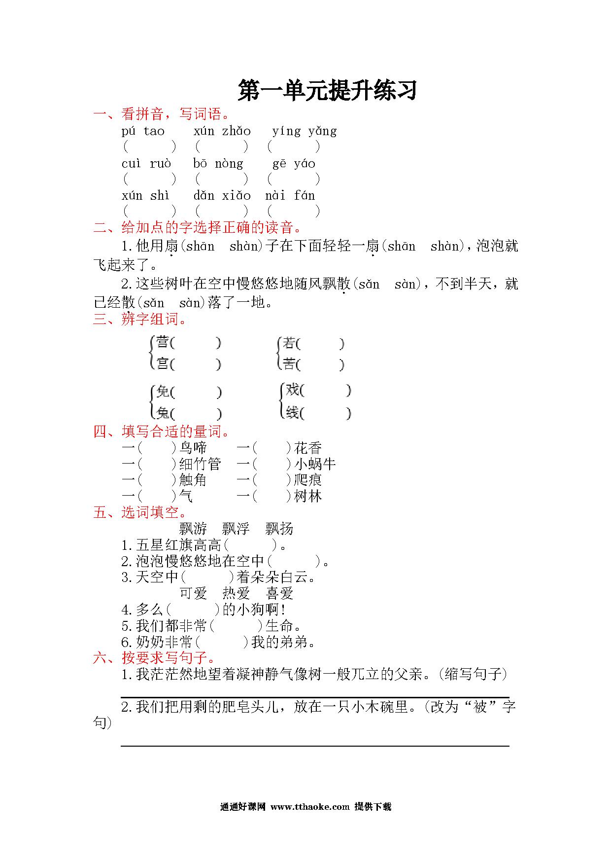 语文版三年级语文上册第一单元提升练习题及答案.pdf