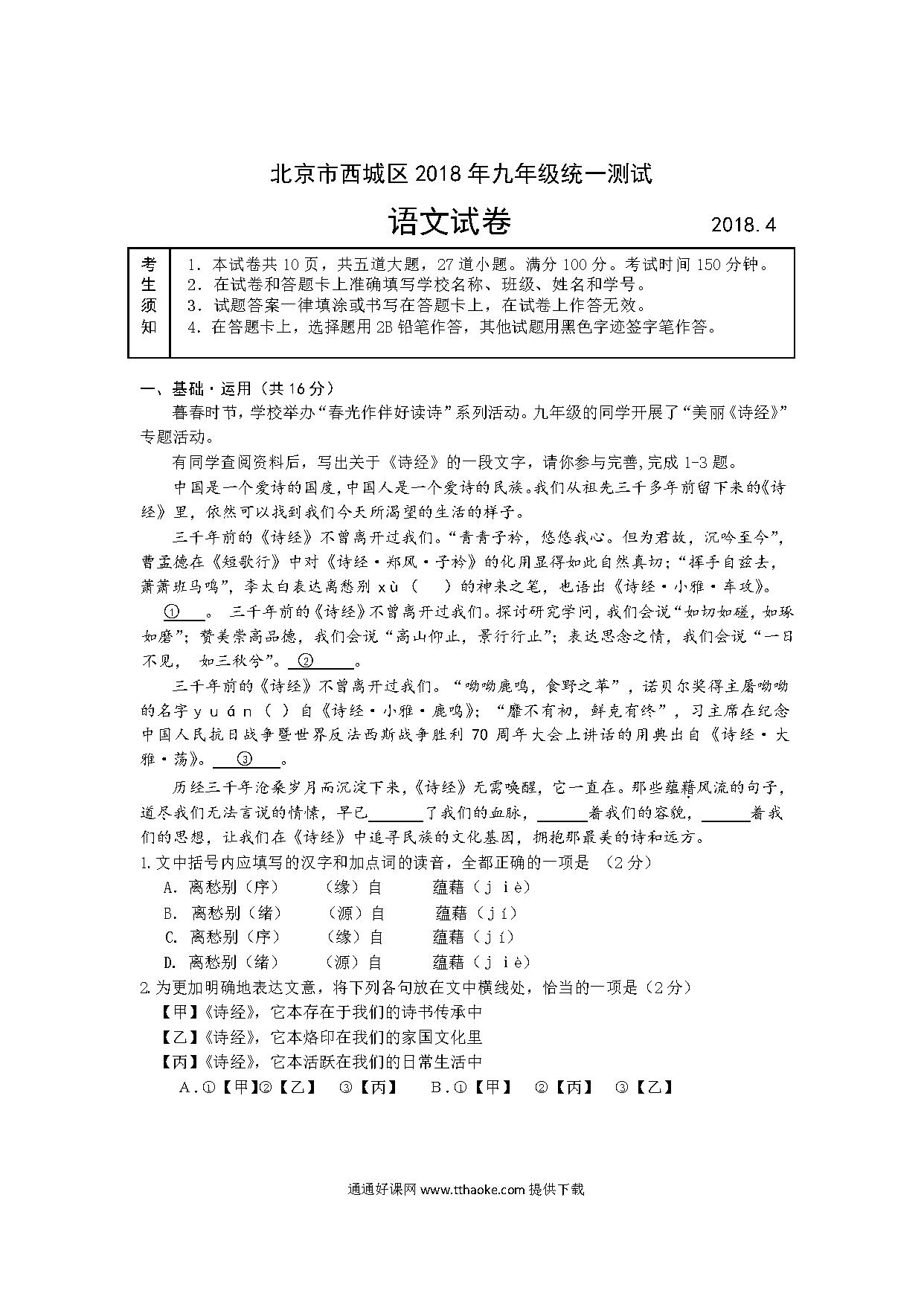 2018年西城区初三一模语文试卷及答案