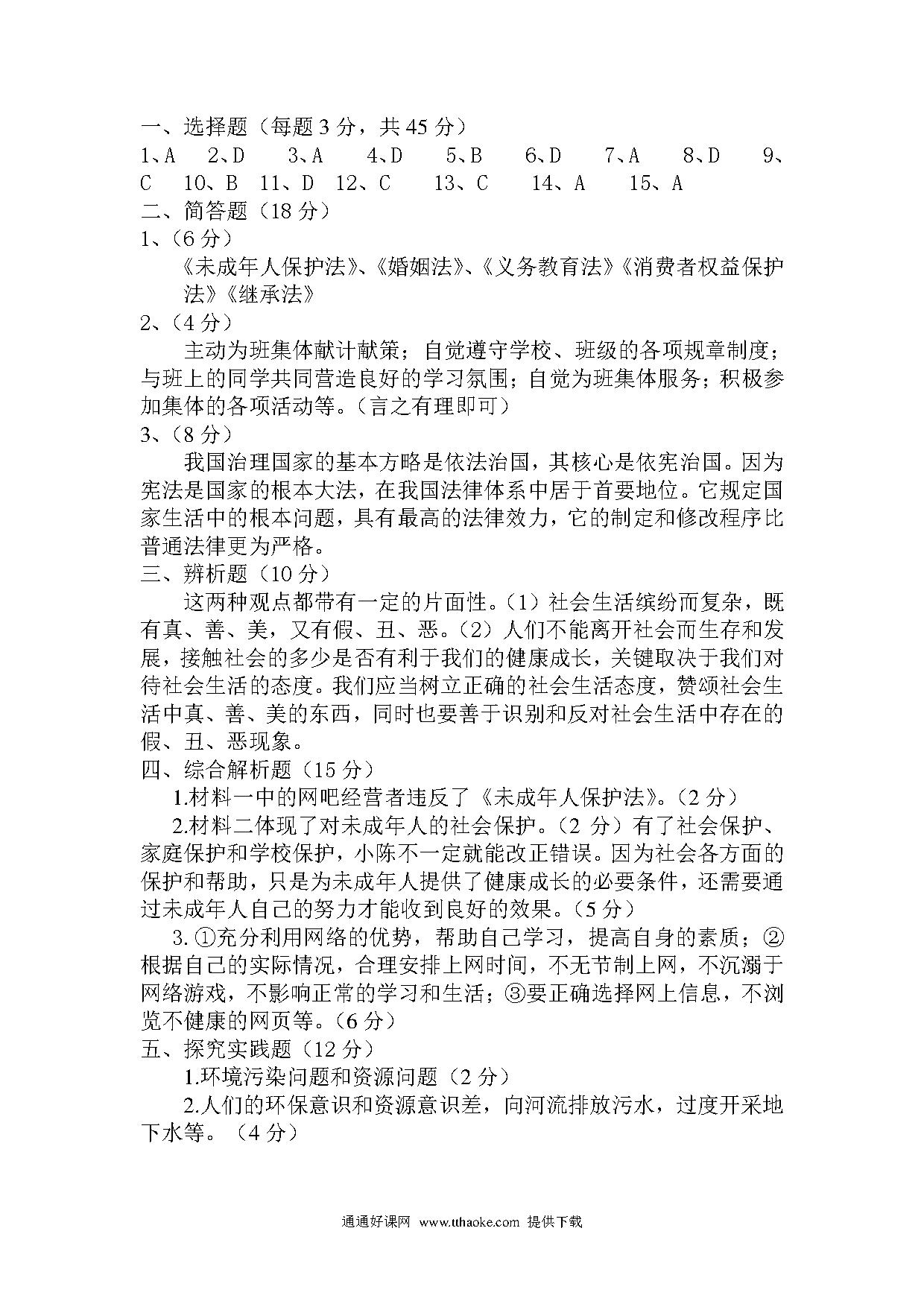 七年级思想品德第二学期期末试题有答案