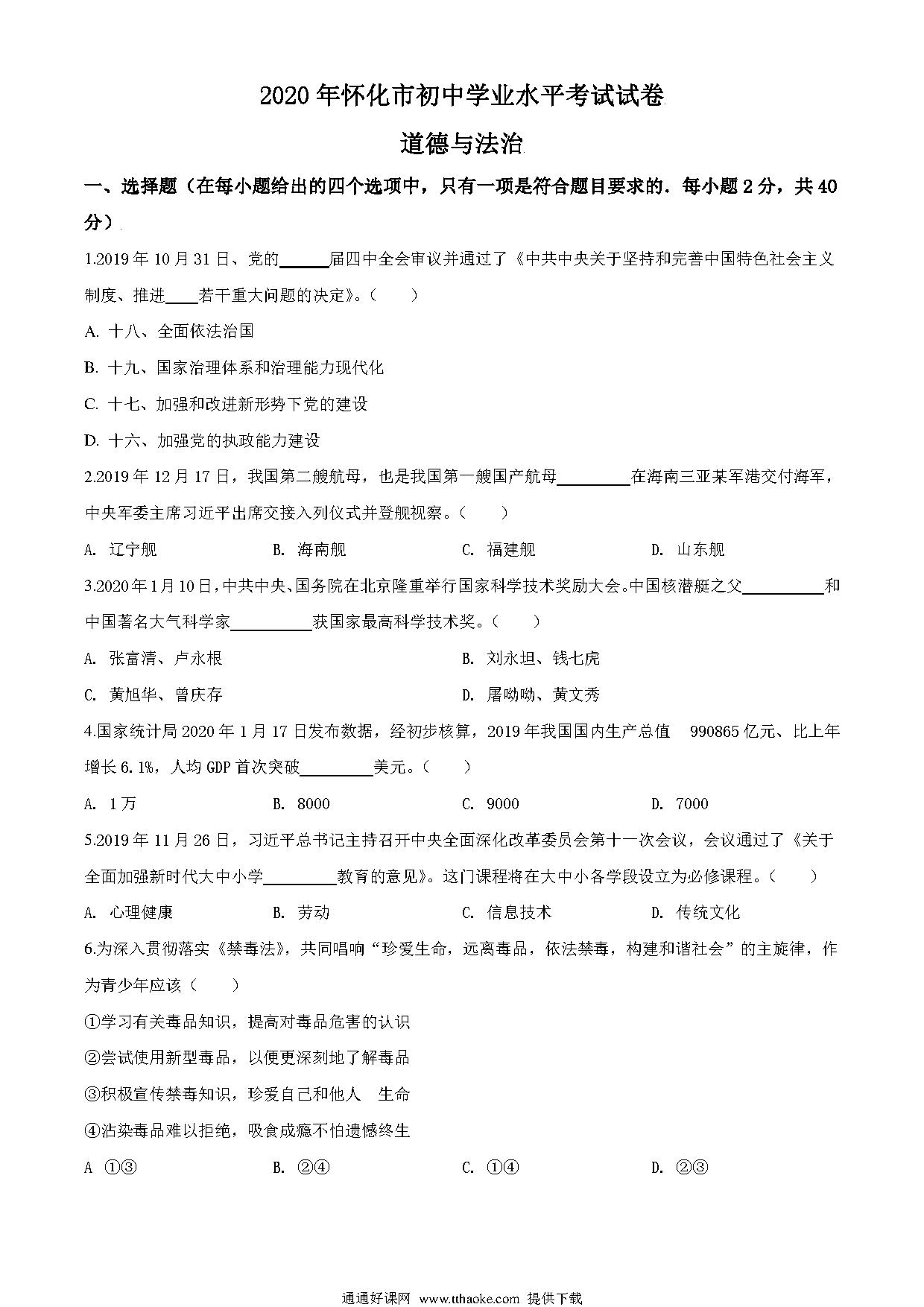 湖南省怀化市2020年中考道德与法治试题(原卷版).pdf