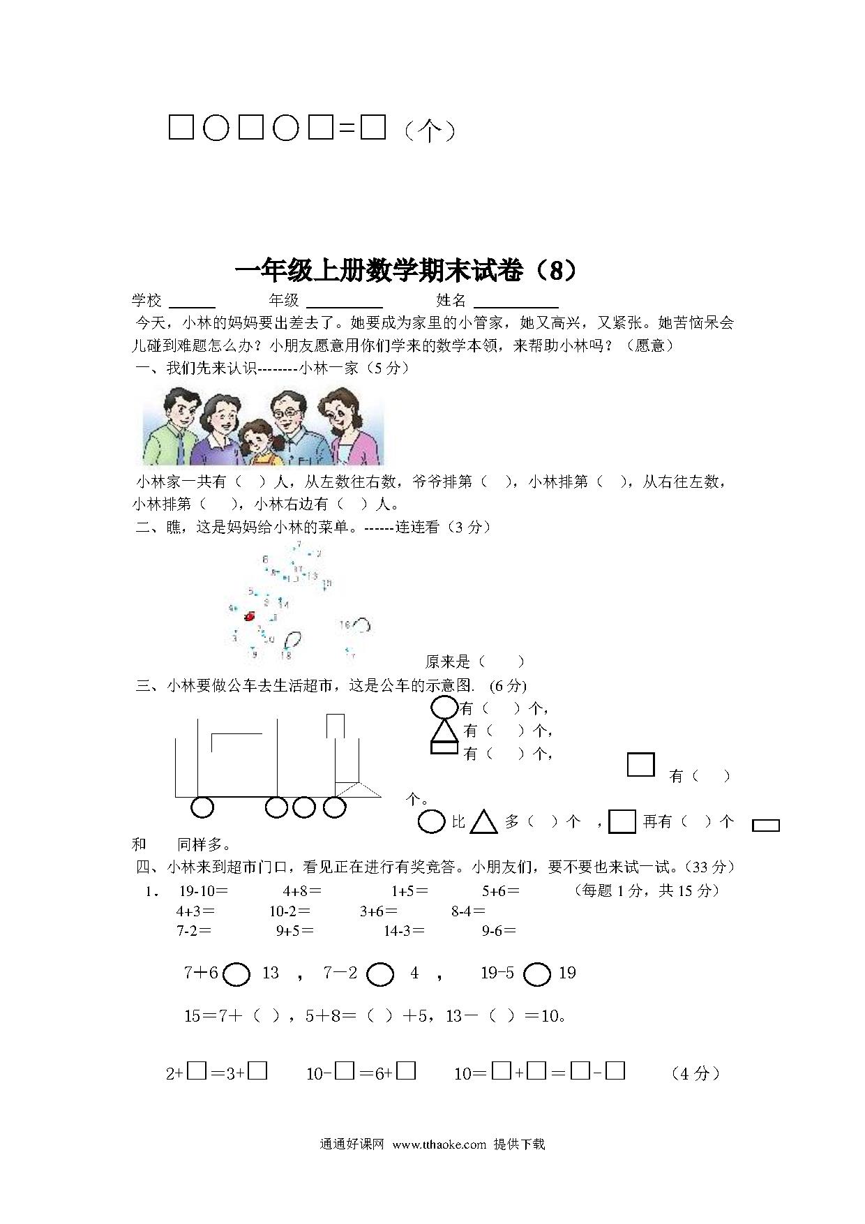 人教版一年级数学上学期期中竞赛试卷免费下载打印(附答案)