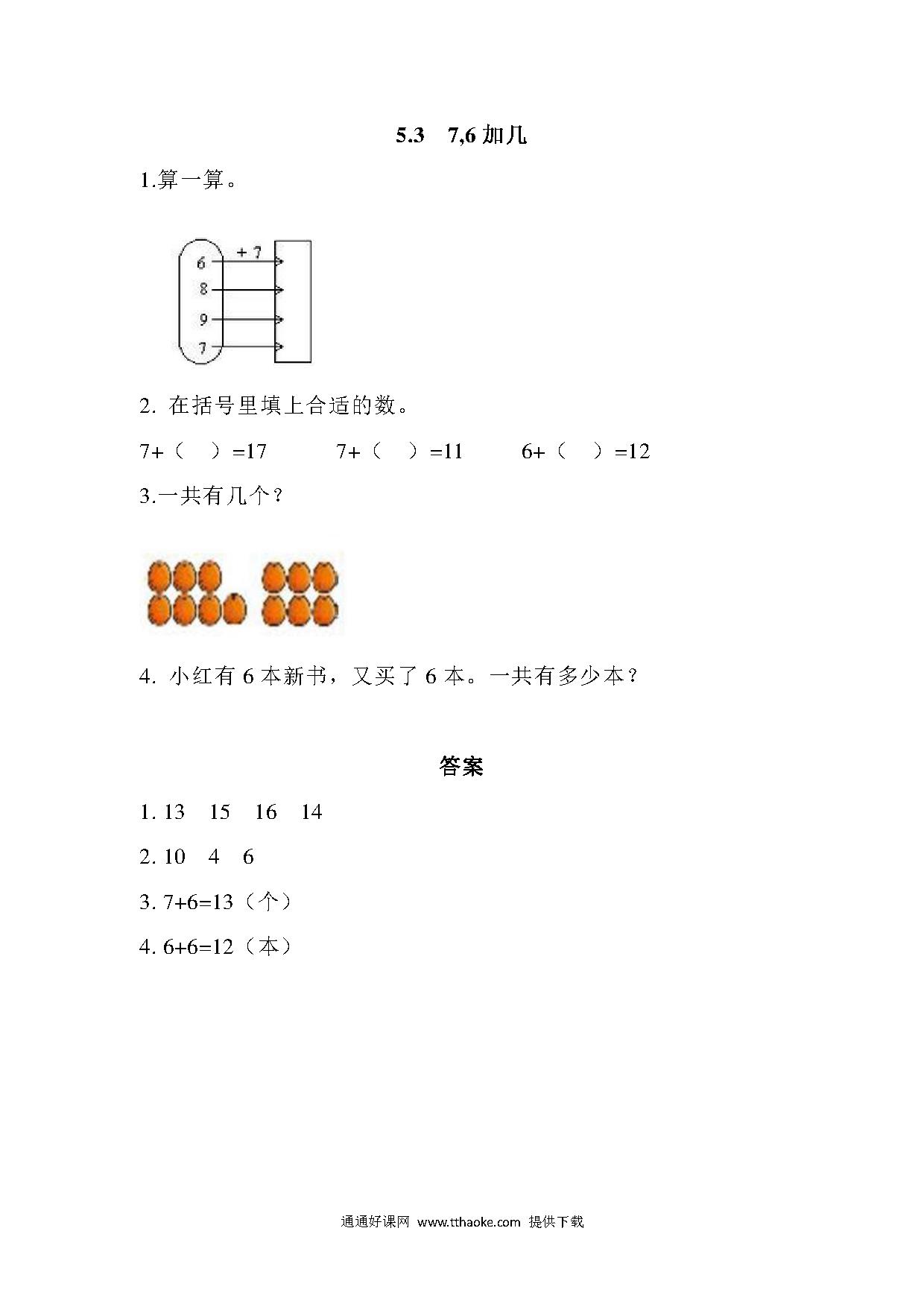 一年级上册5.3 7,6加几练习题及答案【西师大版】