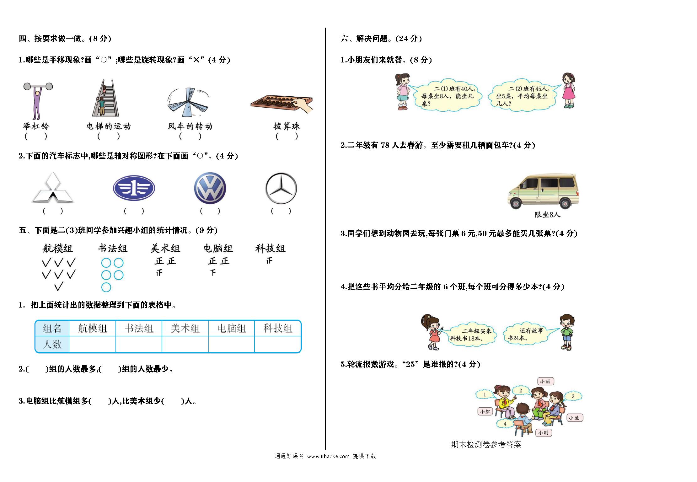 2024人教版二年级数学下册期末考试卷免费下载打印(附答案)