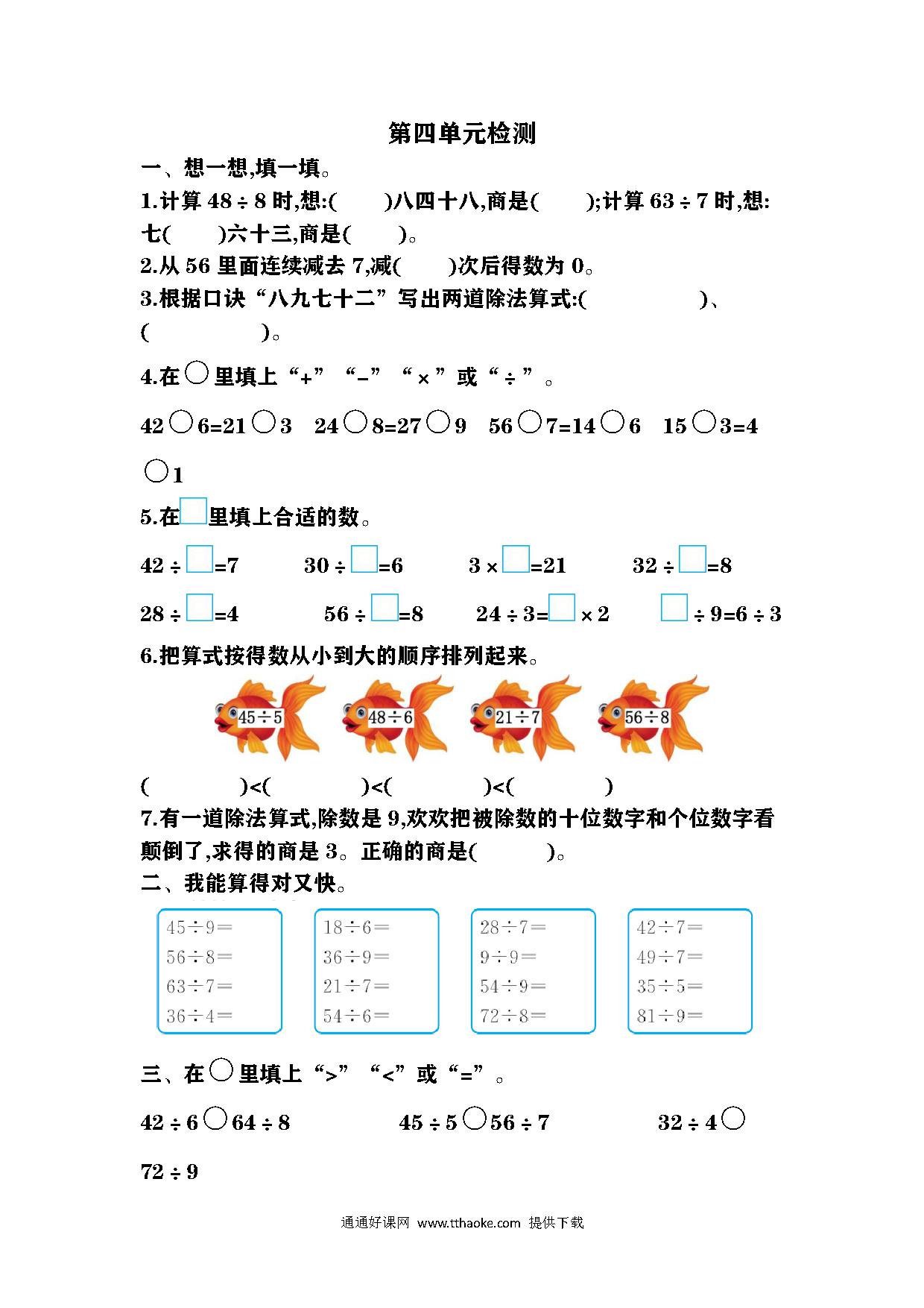 2020-2021学年第二学期人教版二年级数学第四单元测试卷及答案二