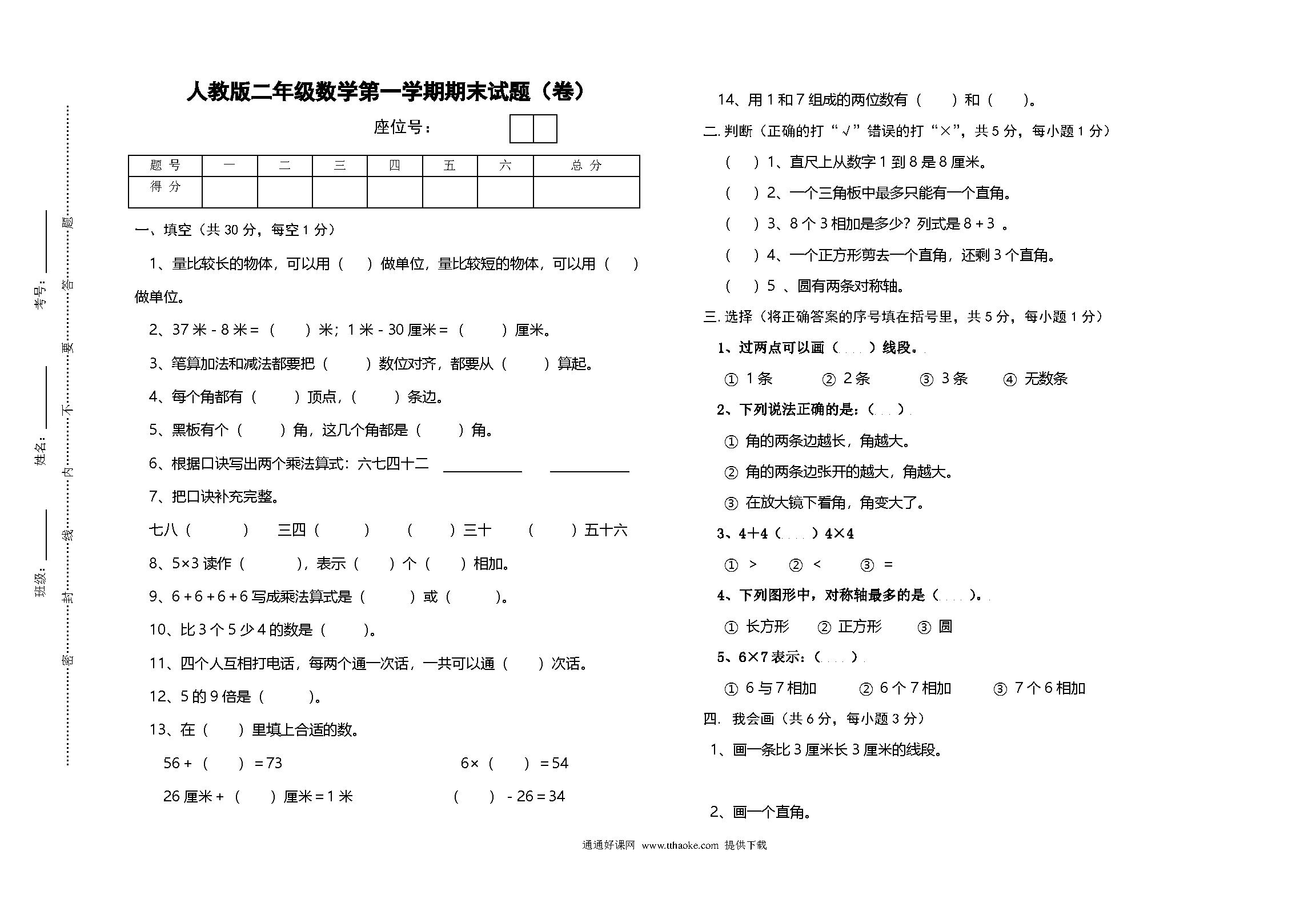 人教版二年级数学第一学期期末试题(卷).pdf