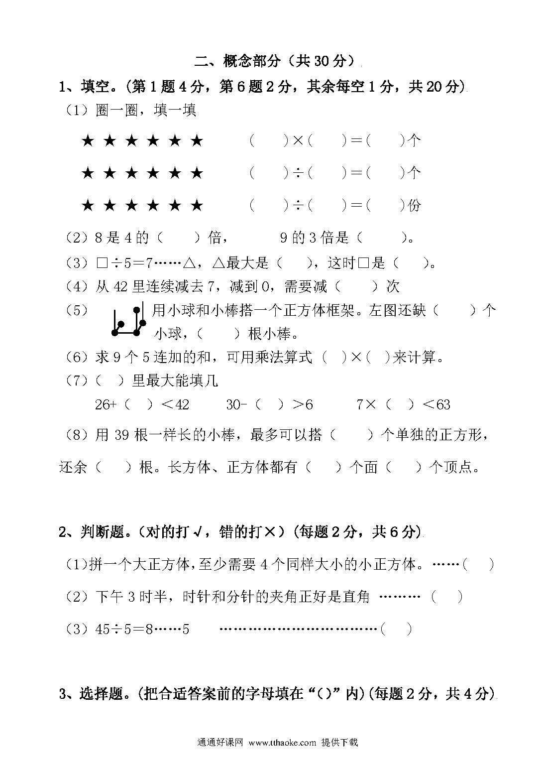2024人教版二年级数学下册期末考试卷免费下载打印(附答案)