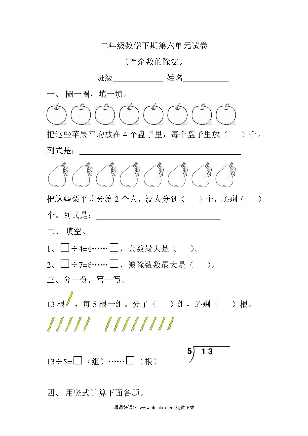 二年级数学下册第六单元有余数的除法测试题2.pdf