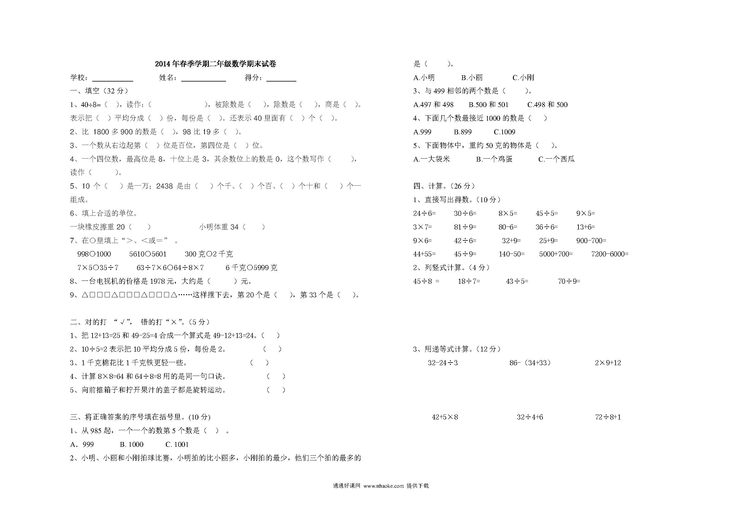 2024学年人教版二年级数学下册期末冲刺卷免费打印下载(附答案)