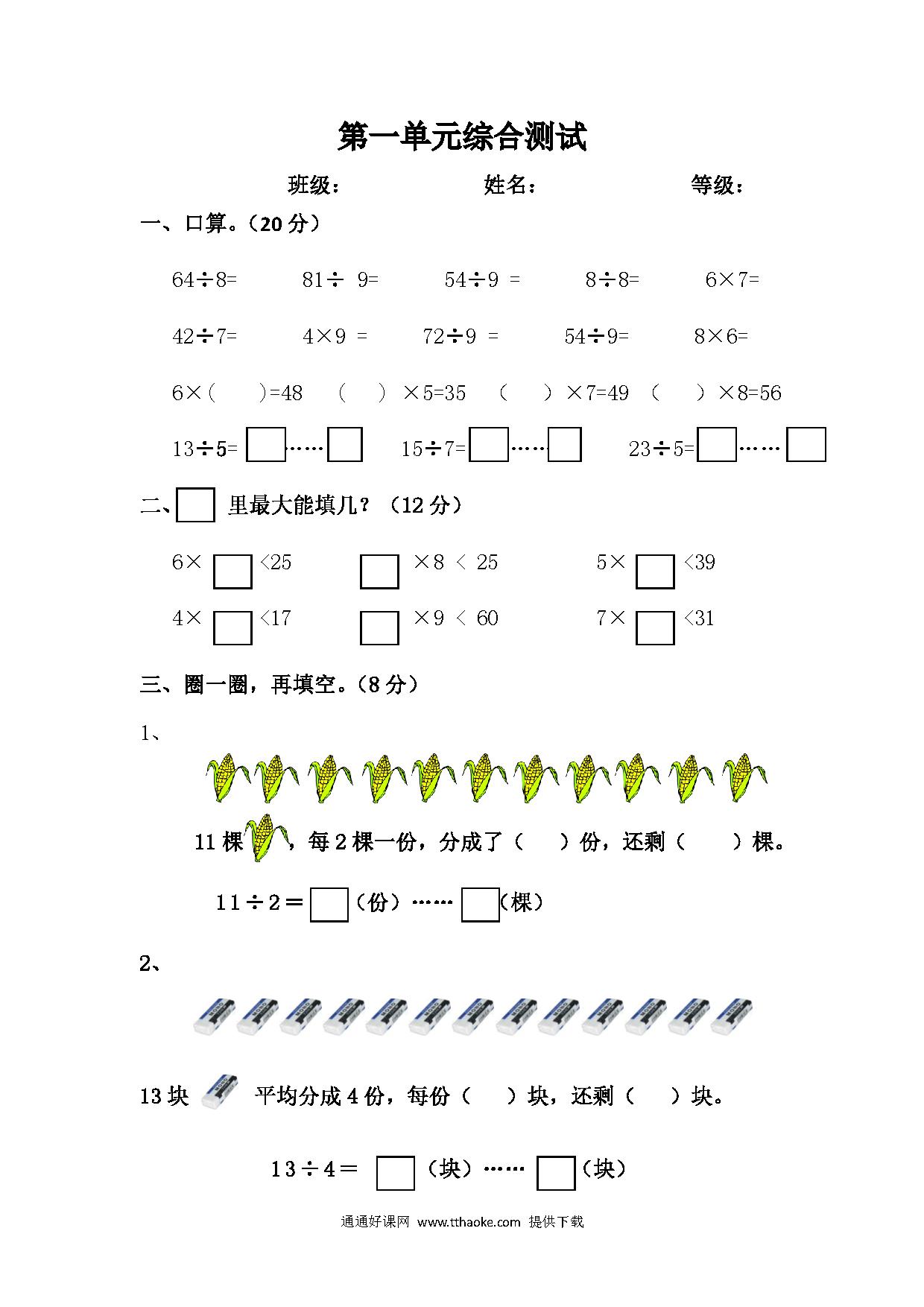 2022年人教版二年级数学上册第一单元测试题附答案(可下载打印)
