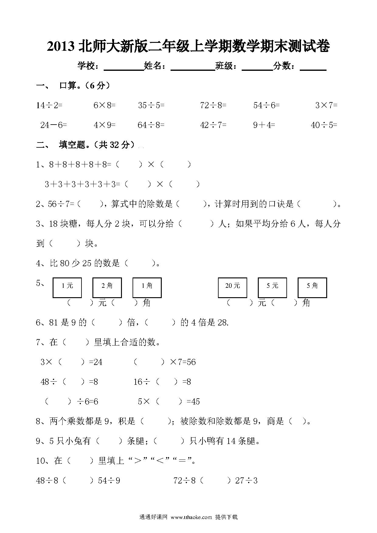 2022年北师大版二年级数学上册期中综合测试卷附答案(可下载打印)