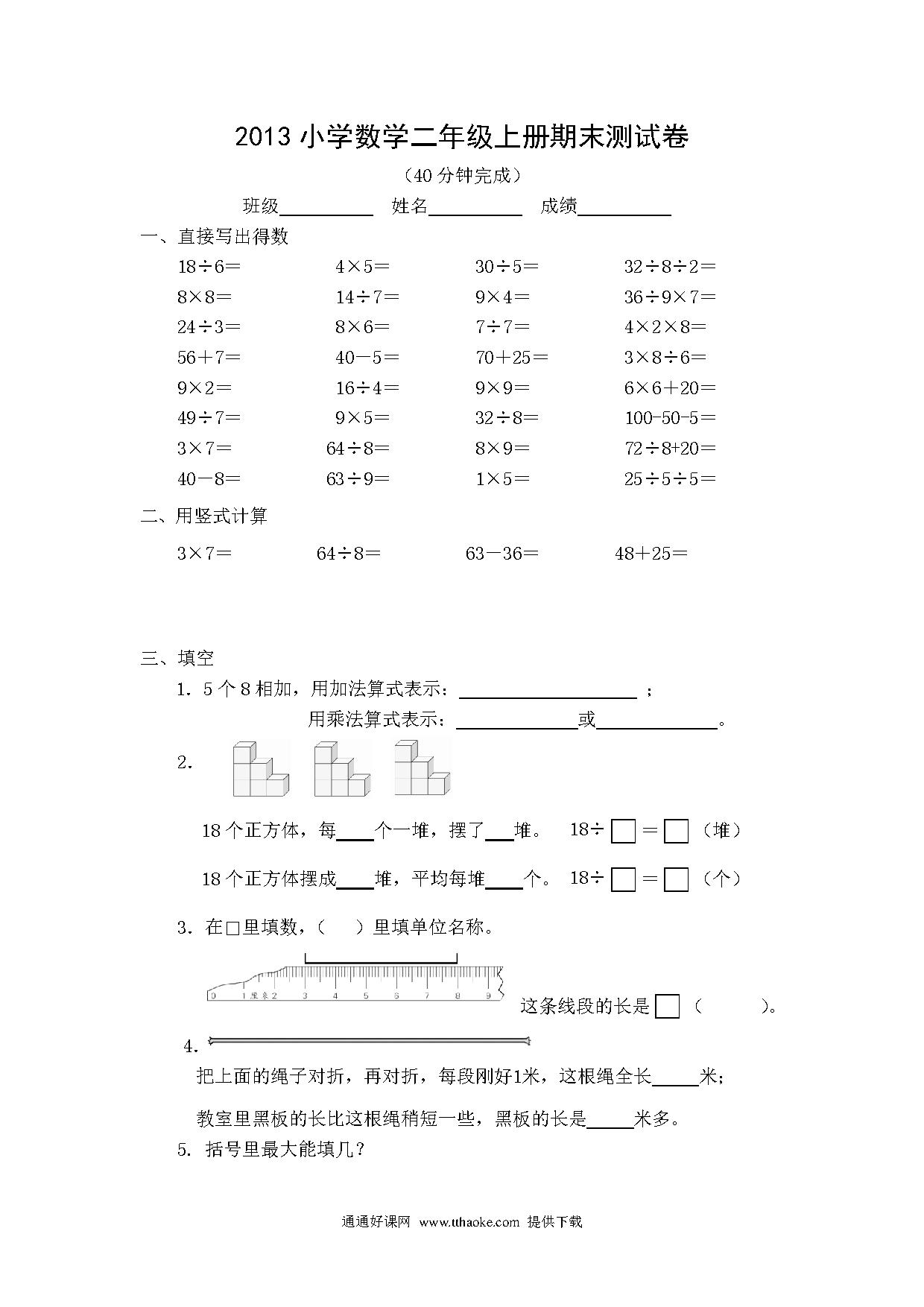 苏教版二年级数学期末考试试卷及答案