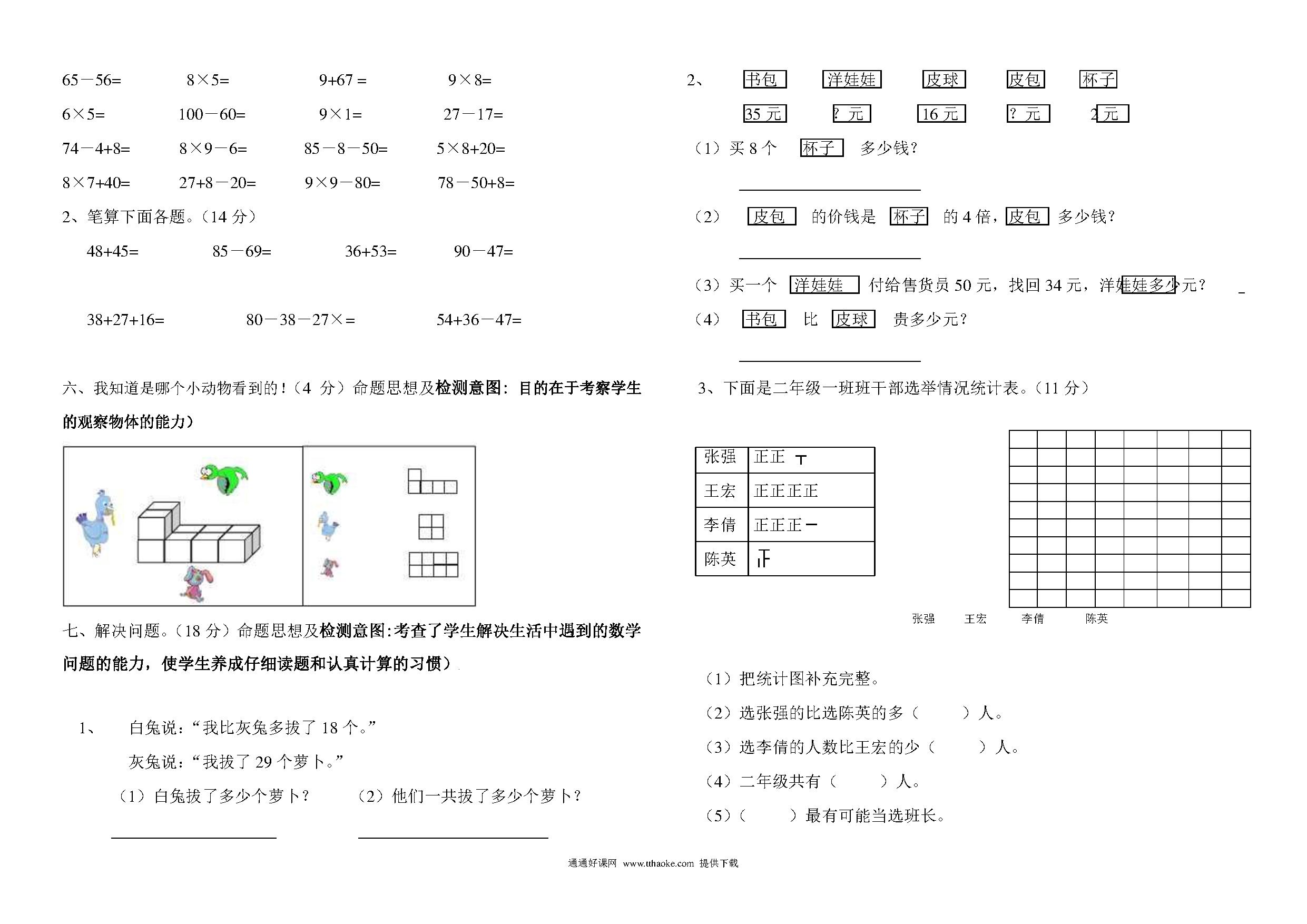 2024人教版二年级数学下册期末考试卷免费下载打印(附答案)