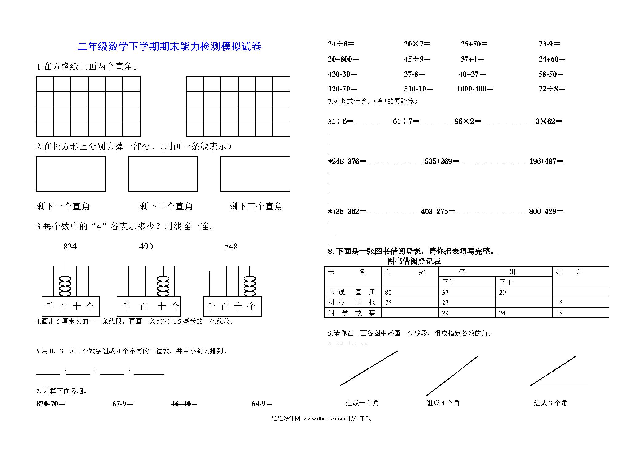 2024学年人教版二年级数学下册期末冲刺卷免费打印下载(附答案)