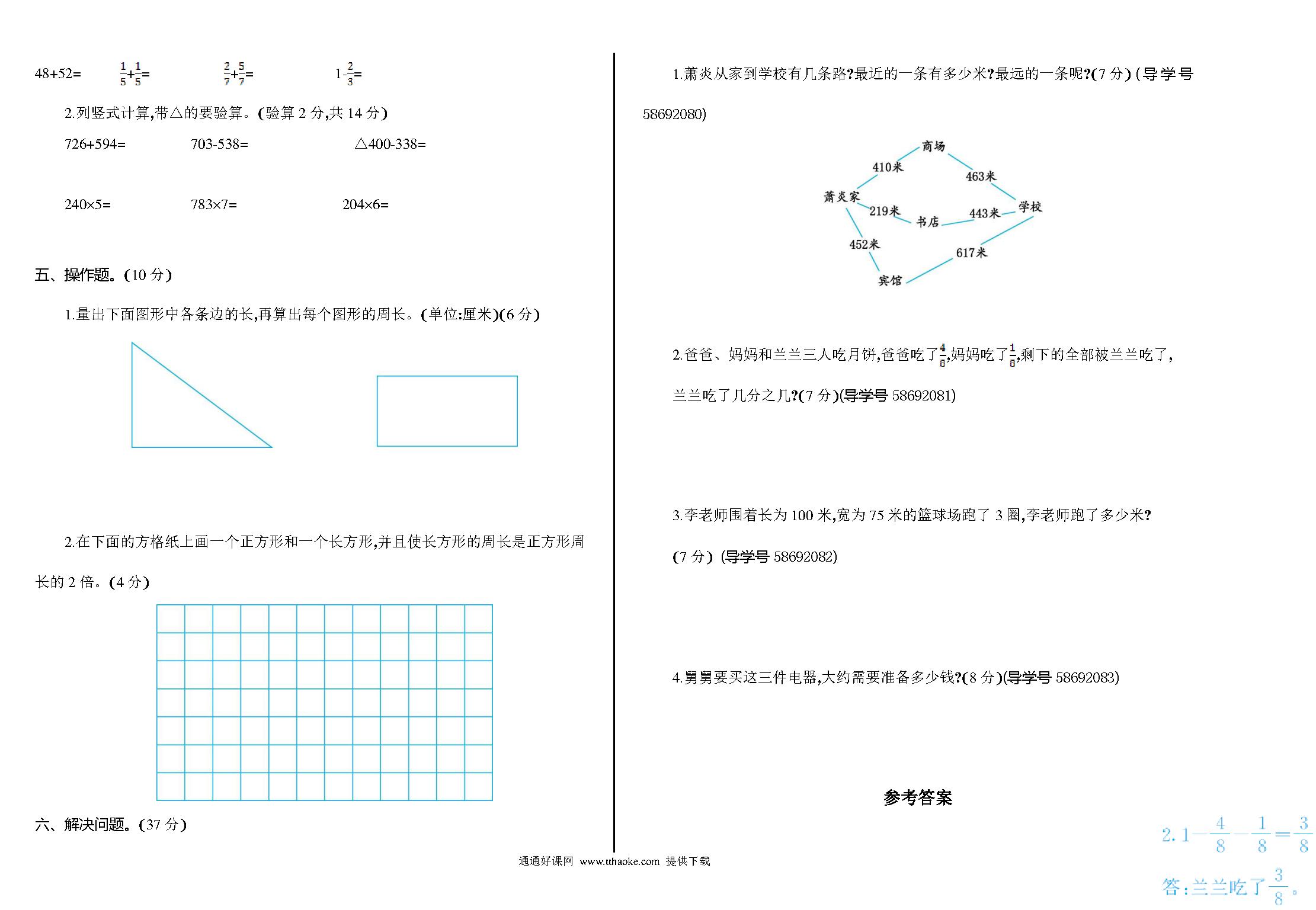 2022-2023学年人教版三年级数学上册期末测试卷可下载打印(附答案)