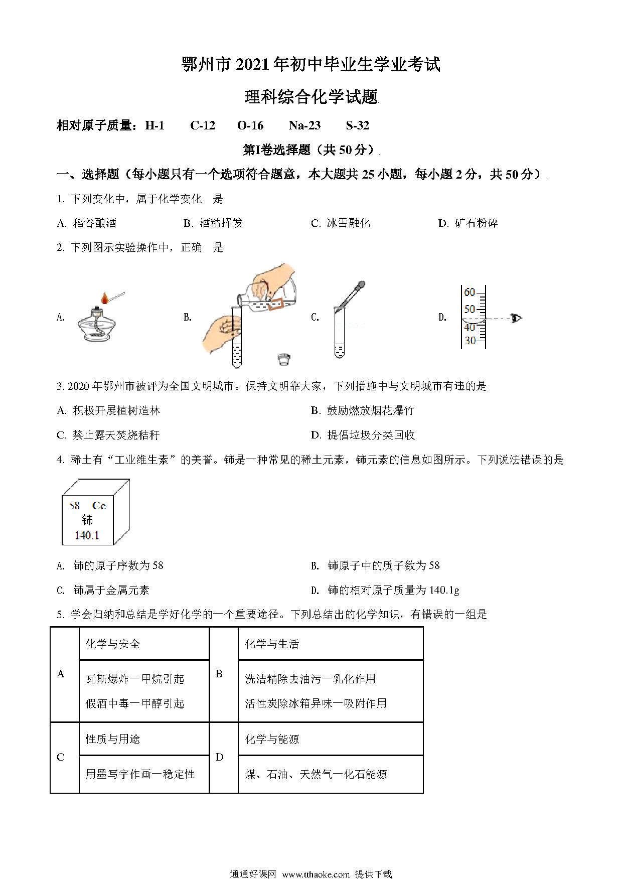 湖北省鄂州市2021年中考化学试题(原卷版)