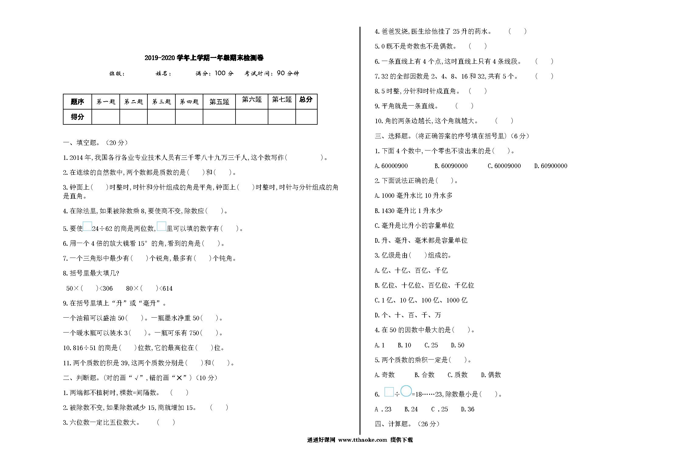 2021年四年级数学上册期末测试题及答案三【冀教版】