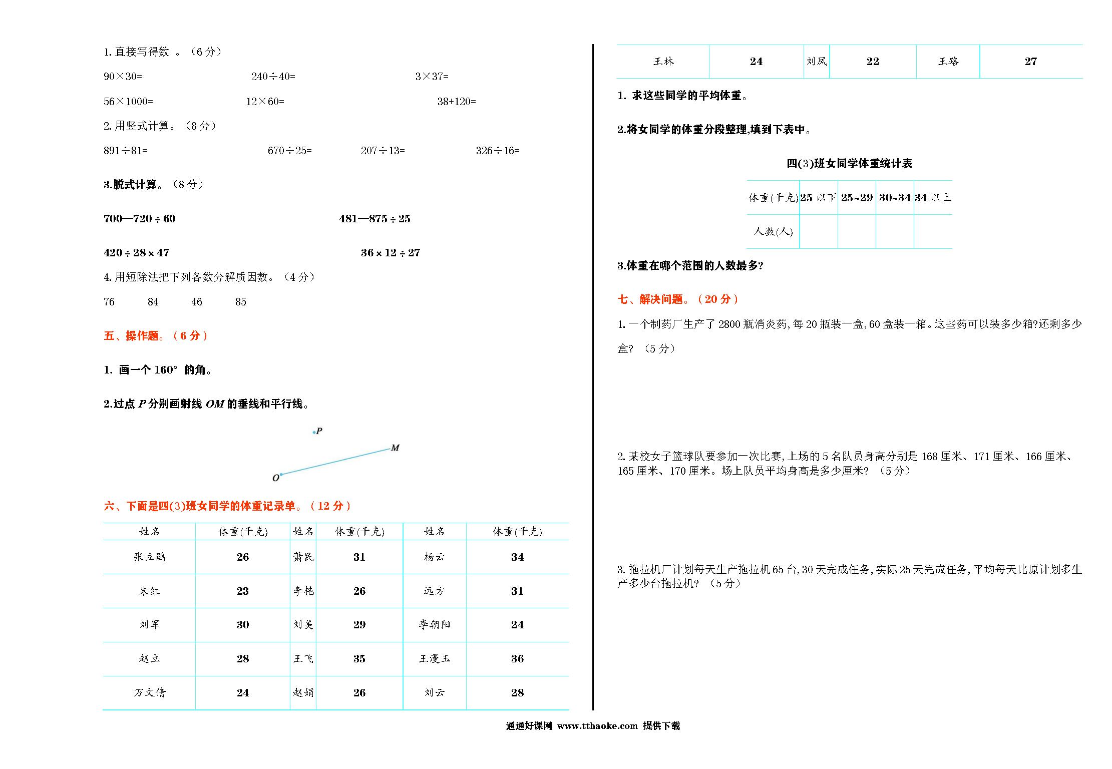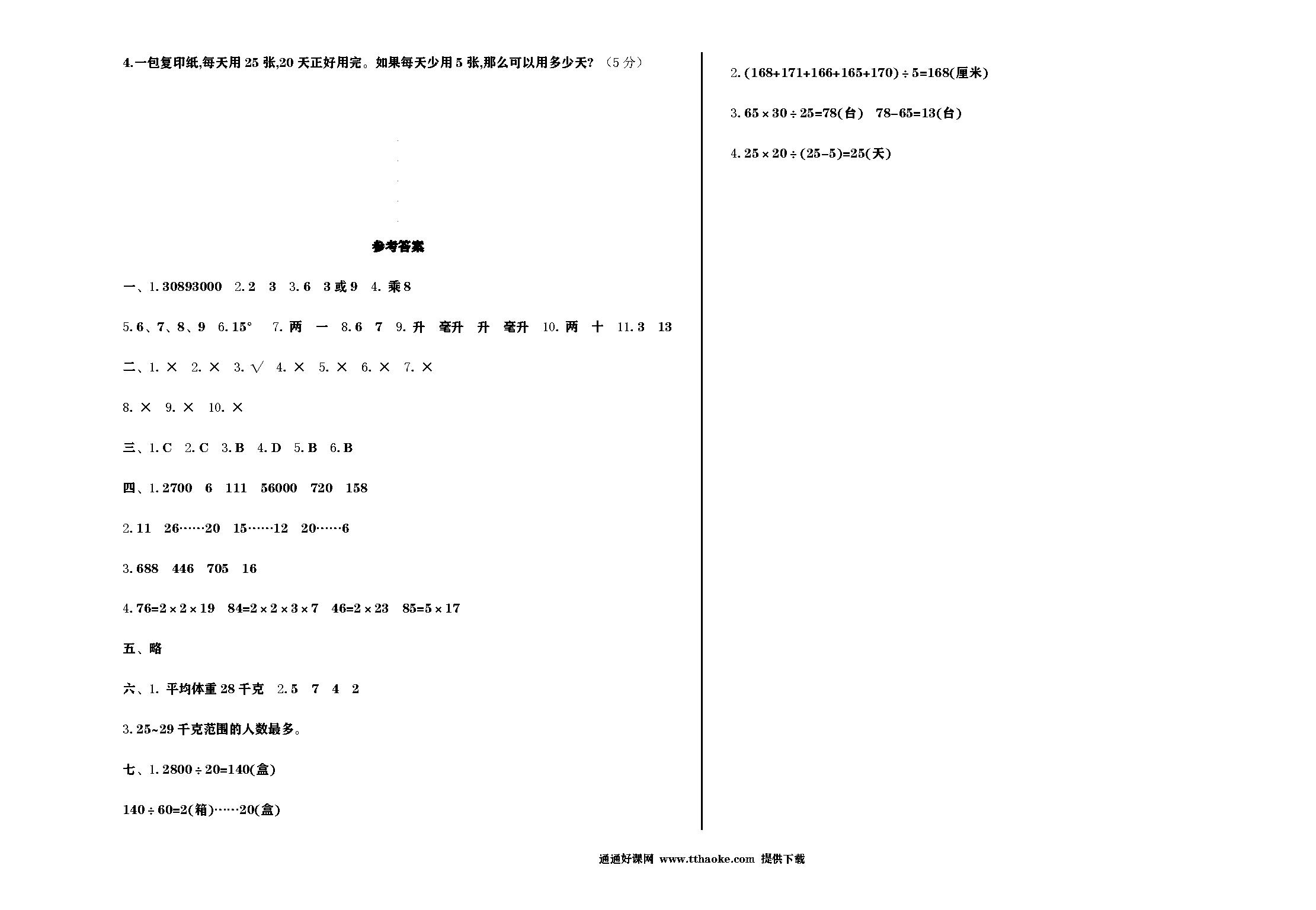 人教版2023年四年级数学下册期末综合测试卷免费下载打印(附答案)