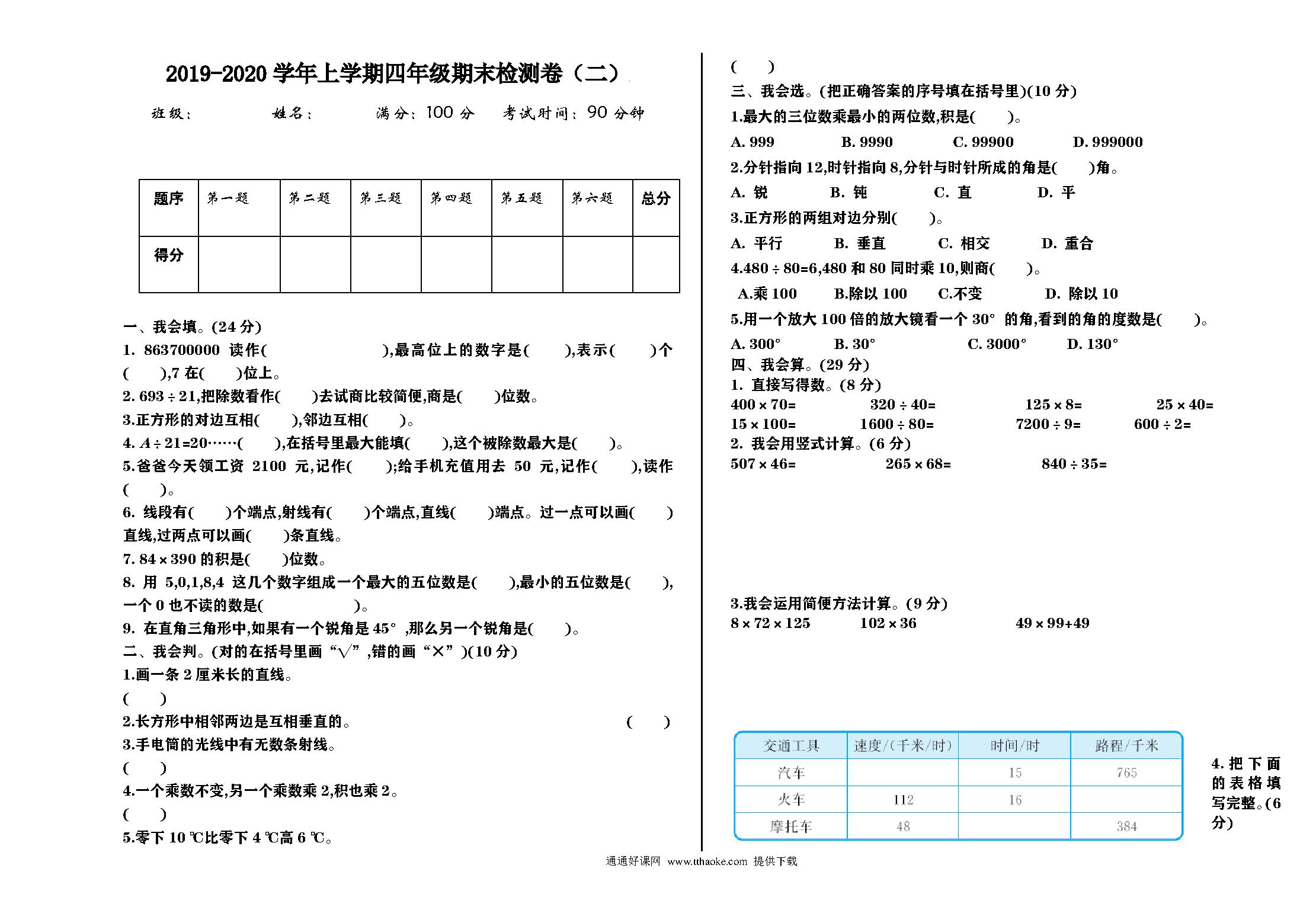 2021年四年级数学上册期末测试题及答案二【北师大版】