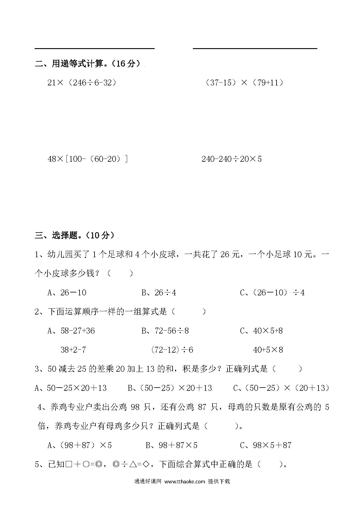 人教版2023四年级数学下册《常考易错选择题》冲刺卷免费下载打印(附答案)