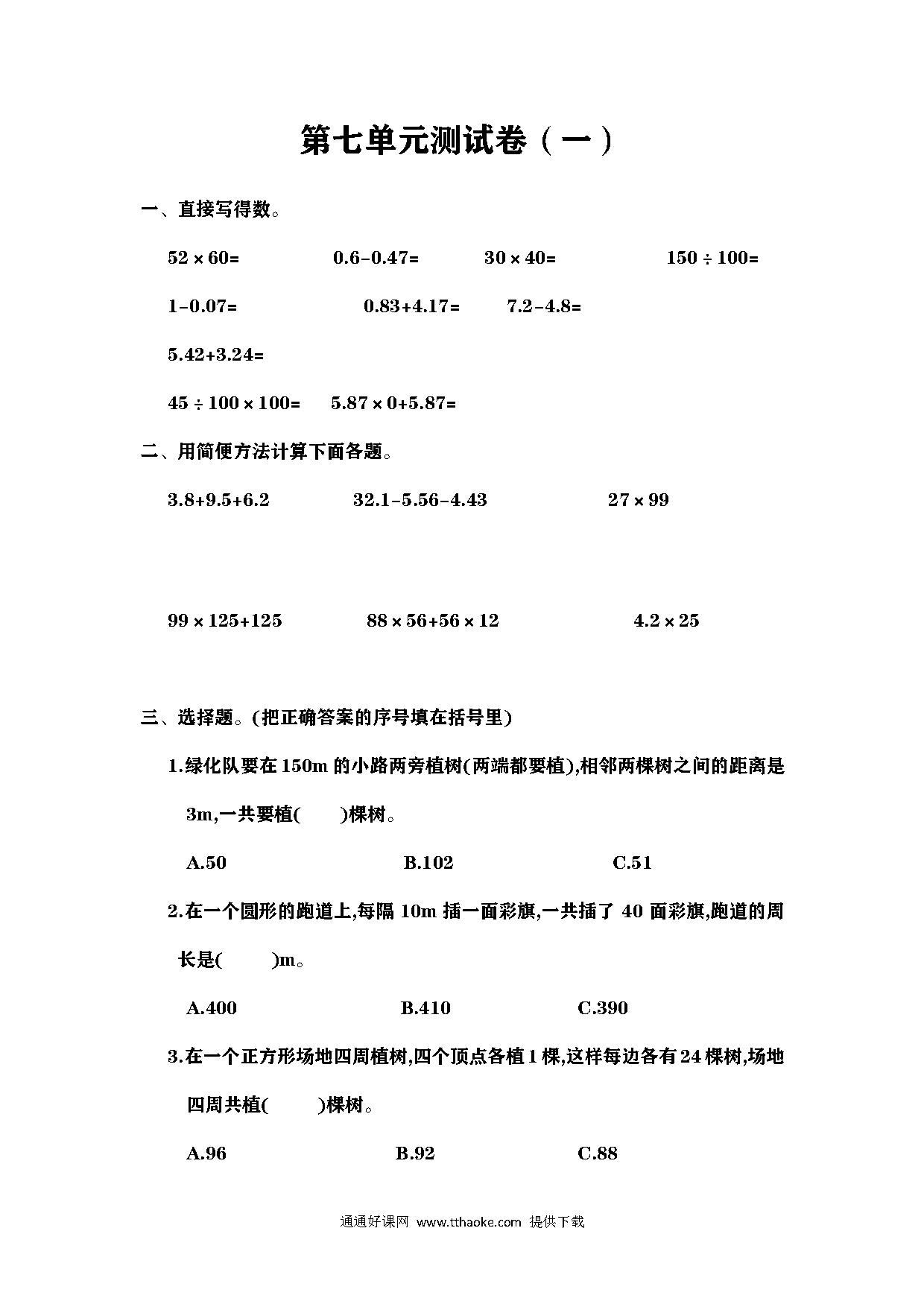 2020年人教版五年级数学上册第七单元测试题及答案(一).pdf