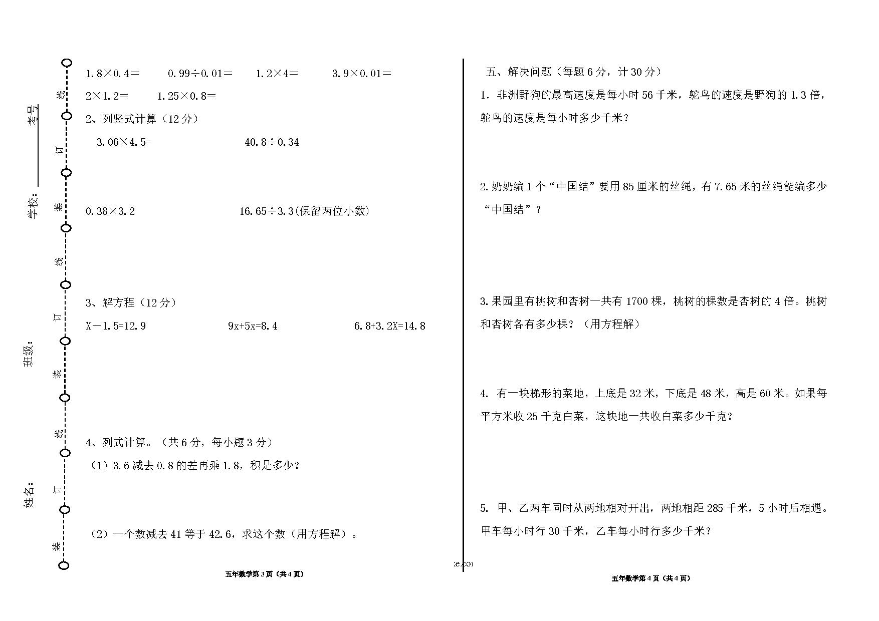 2022年人教版五年级数学上册期中复习能力测试卷可下载(附答案)