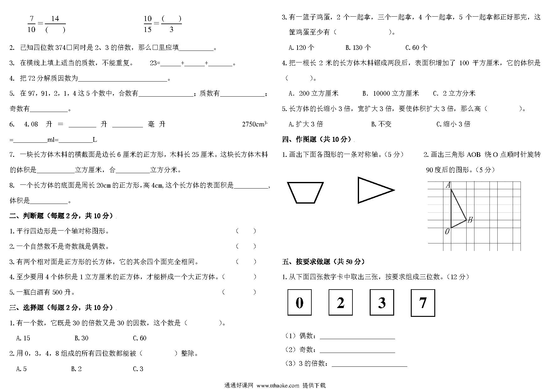 2022学年北师大版五年级数学下册期末测试卷及答案