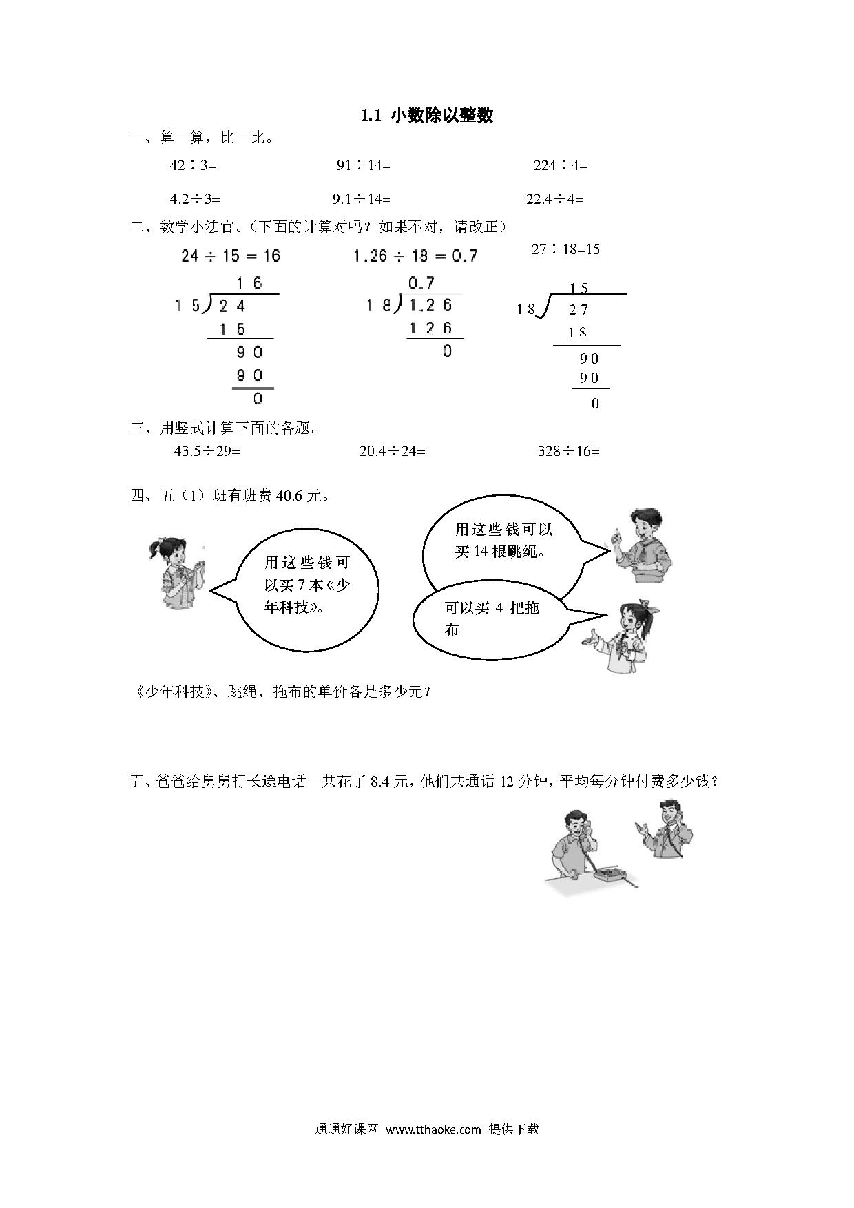 1.1 小数除以整数练习题及答案【北师大版】