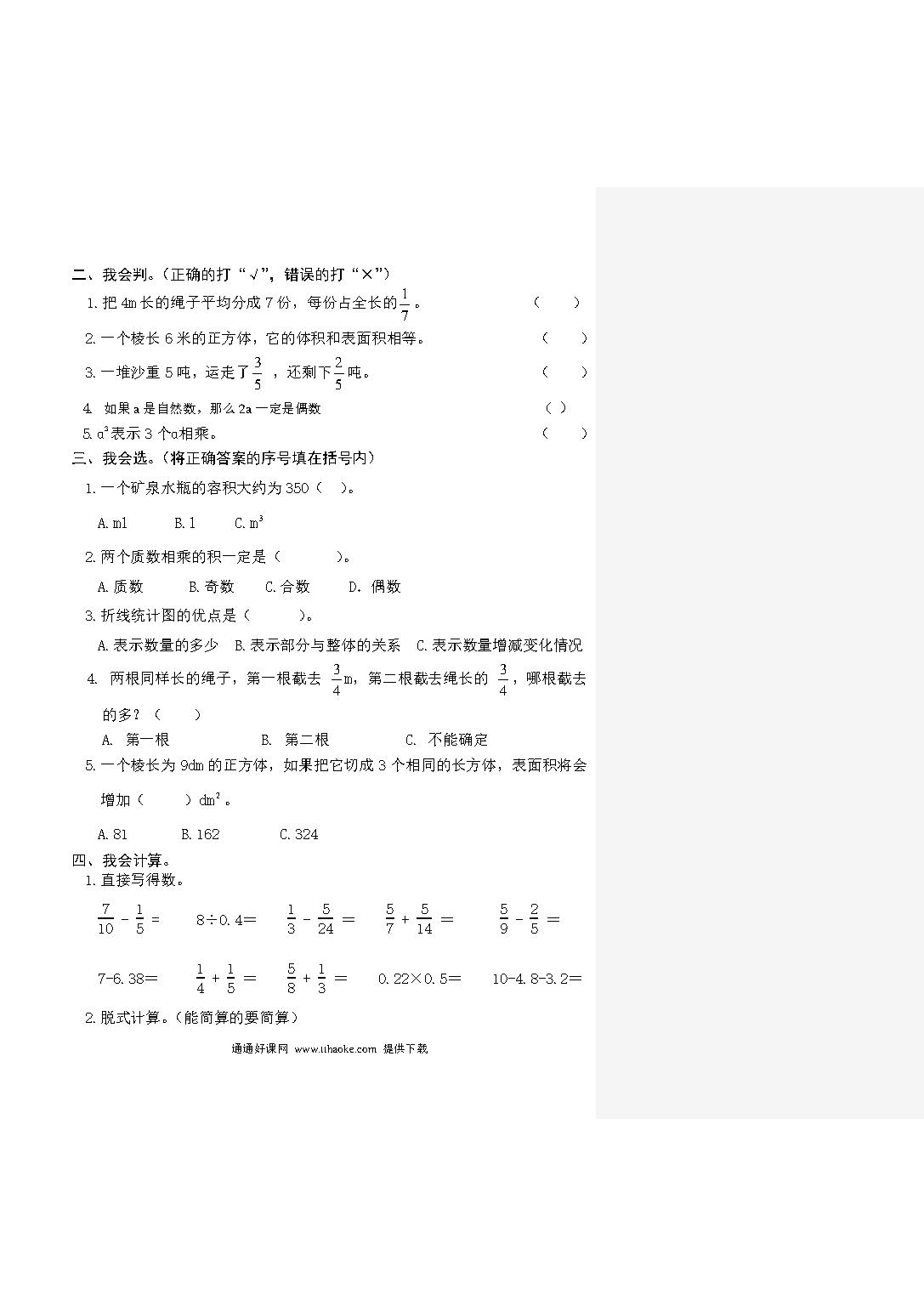 2022学年北师大版五年级数学下册期末测试卷及答案
