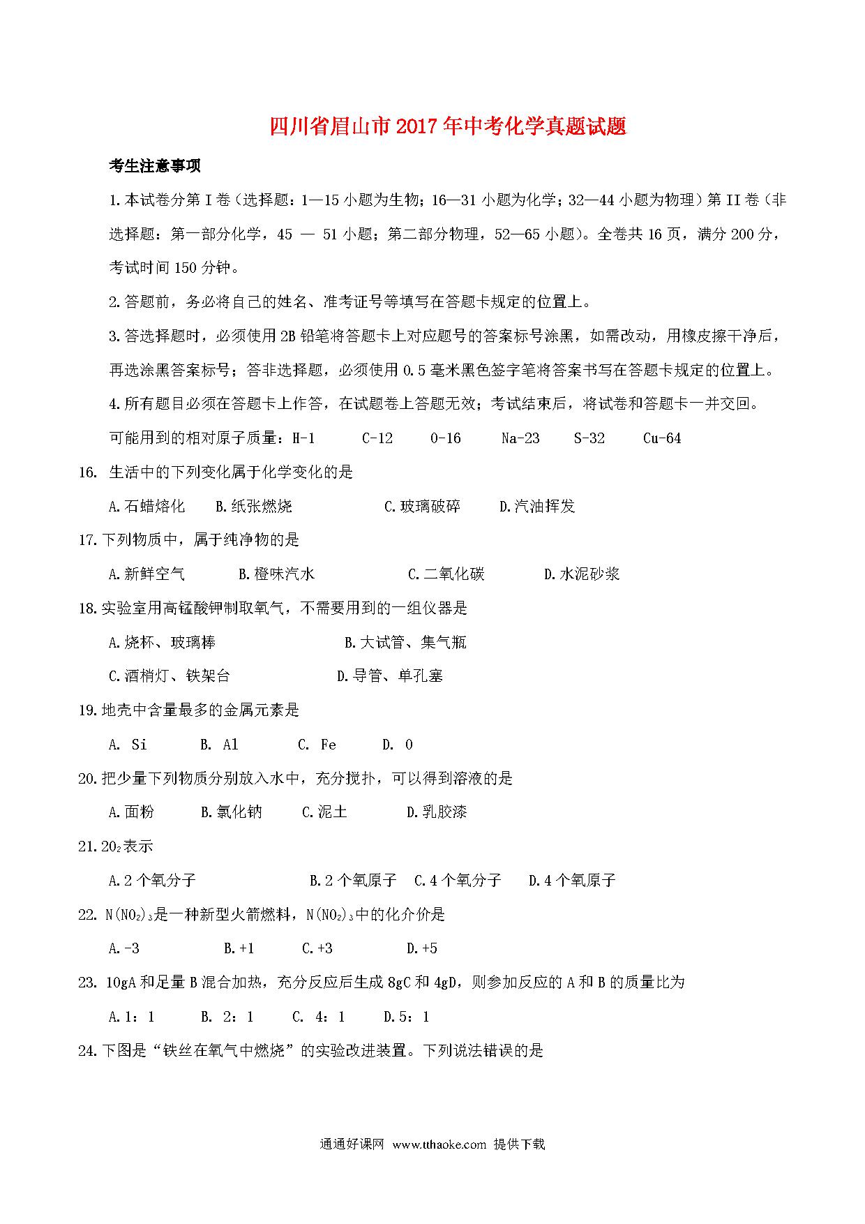 四川省眉山市2017年中考化学真题试题(含答案).pdf