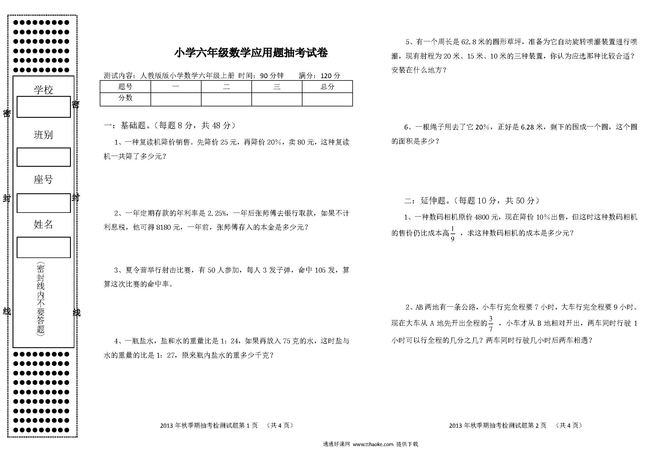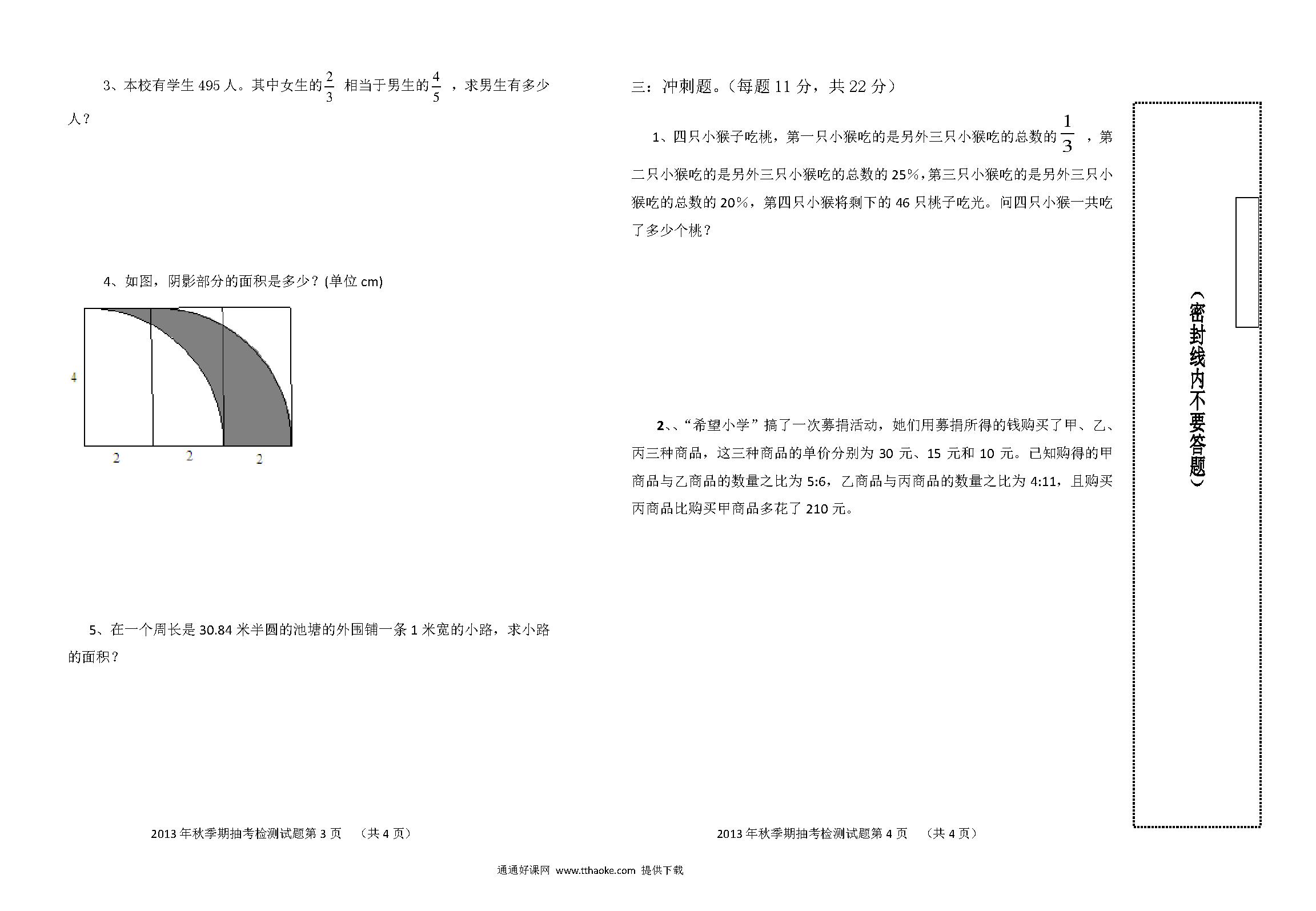 2022年苏教版六年级数学上册期中综合质量调研试卷可下载(附答案)