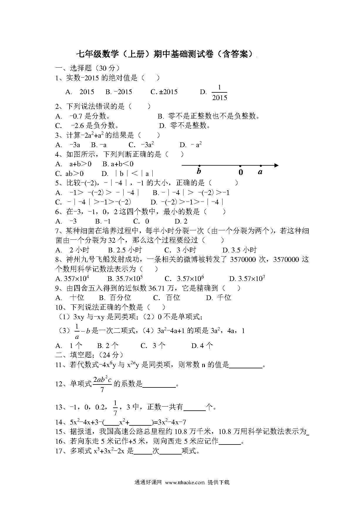 湘教版七年级数学上册期中基础测试卷(含答案).pdf