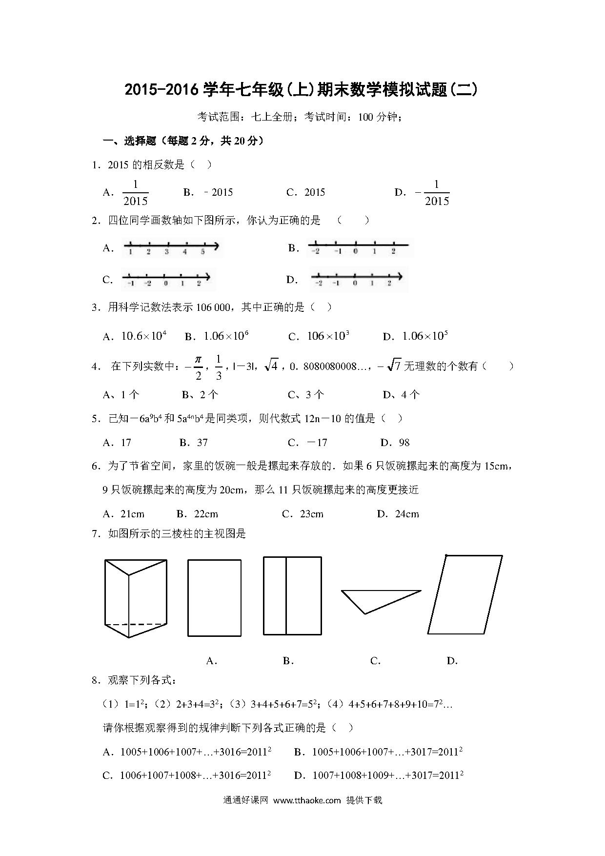 2015-2016学年七年级(上)期末数学模拟试题(二)及答案.pdf (501.93KB)