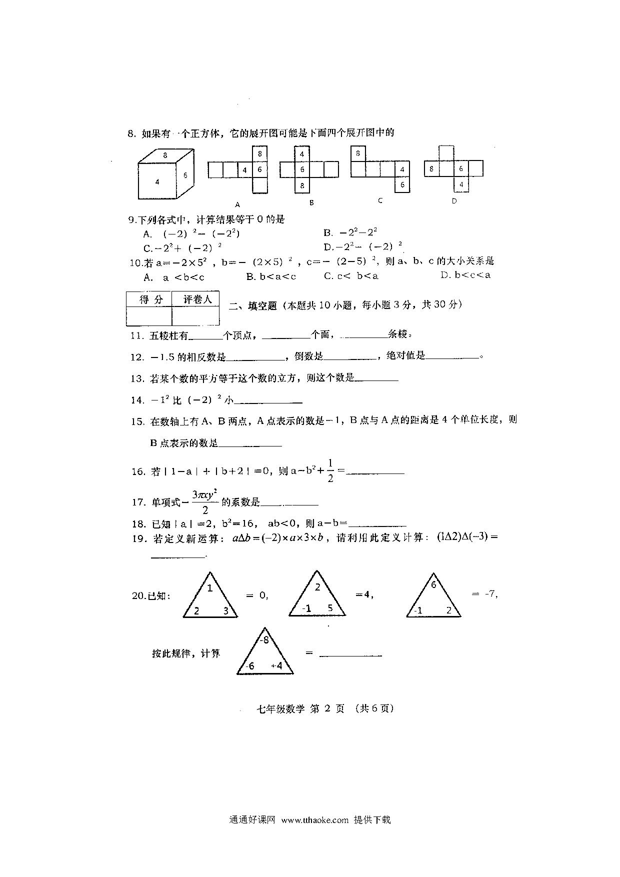 2019年湖南衡阳七年级上数学期末试卷及答案