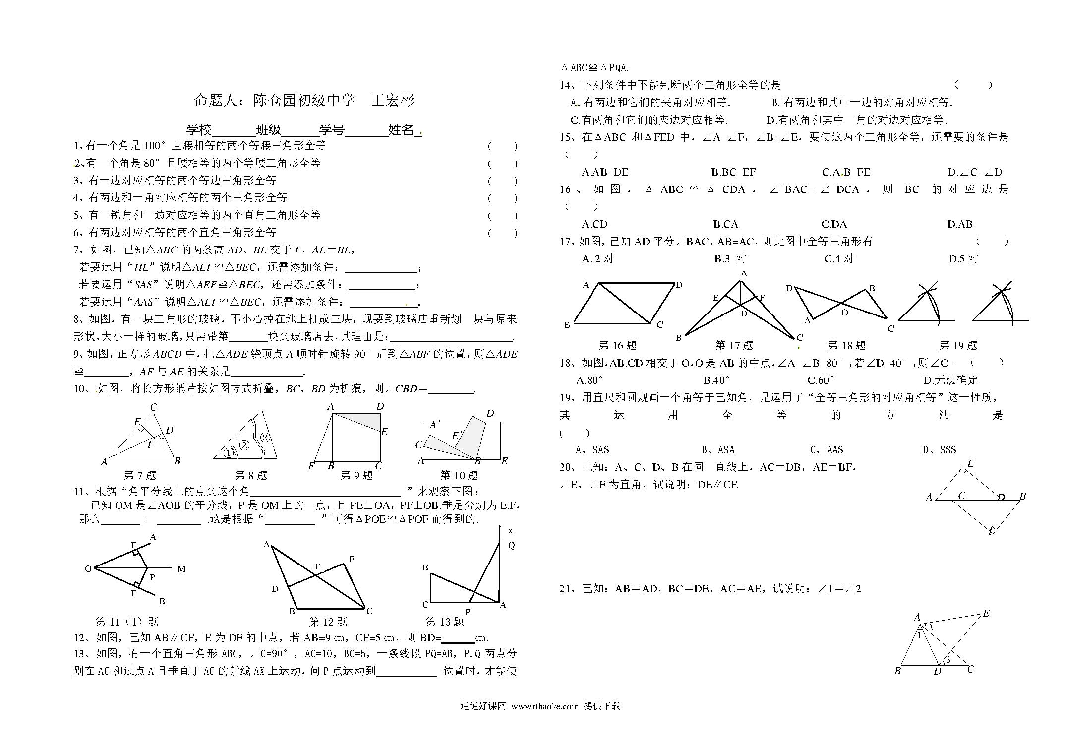 淮北市2019年第一学期七年级数学期末试卷及答案