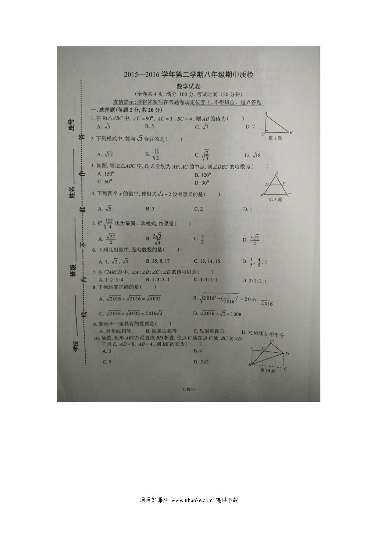 长乐市八年级数学下学期期中试卷及答案.pdf